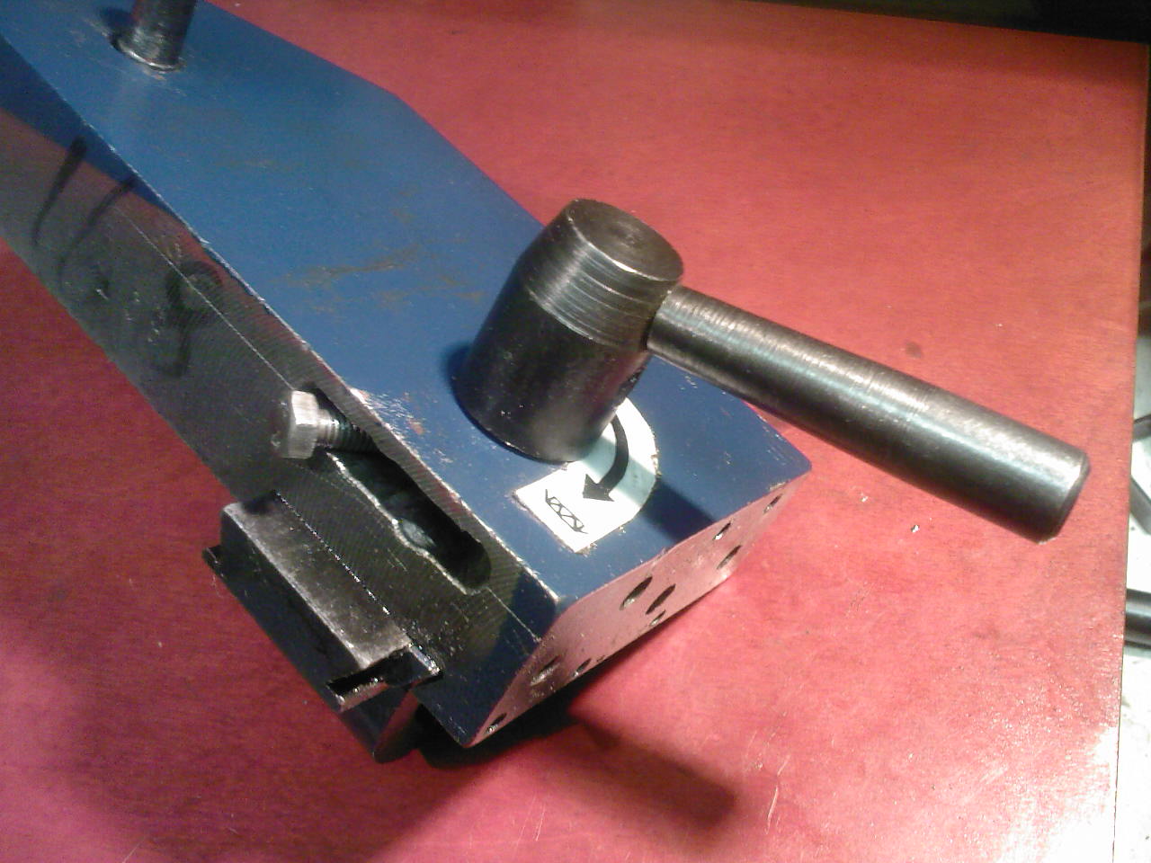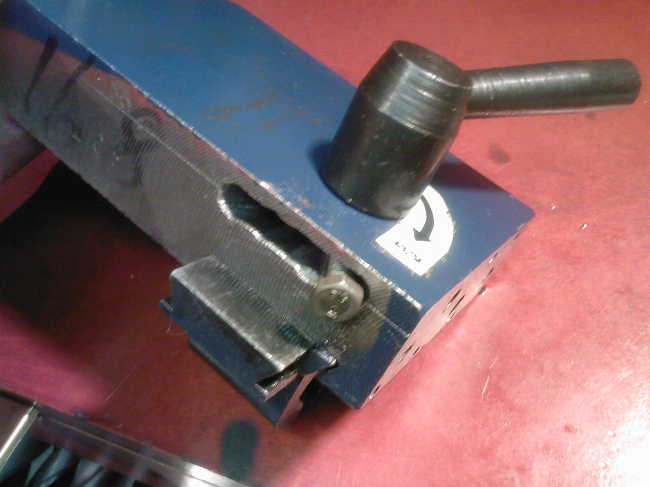 Tak jsem se do toho pustil a napadlo mě tohle. Myslím, že nemá cenu nic komentovat, vše je vidět z obr. Na ten šroub M5 bude dělaný doraz a snad to bude makat. Myslím si, že ba mohlo. Vlastně pokud něco narazí na ten šroub tak klika sama pšeskočí, ten šroub je tam jen zatím, bude vyměněn.