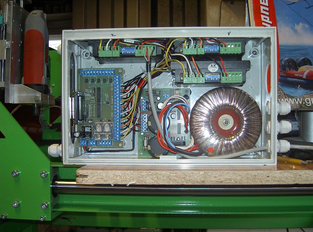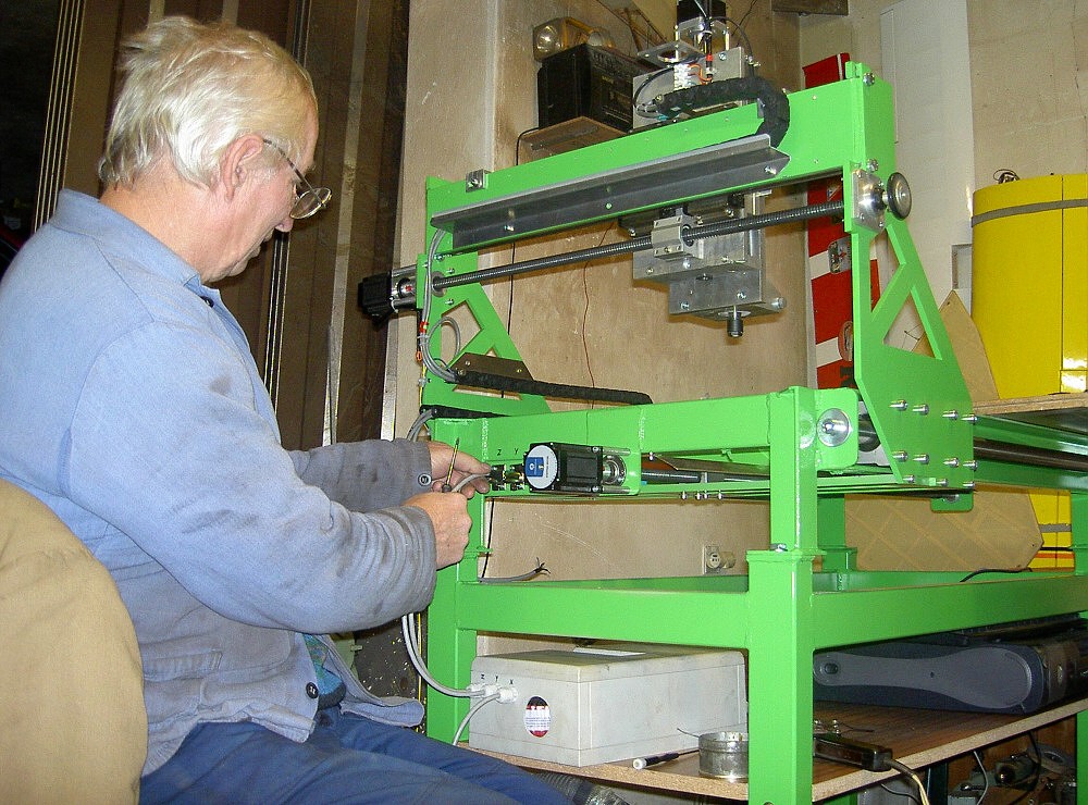 Konstrukce je kovová,osa X jezdí na tyčích 30/1000,kuličková pouzdra,Z-ko je na tyčích 20,Y lin vedení. Trapéz šrouby 16/4,krok. motory 1,9 Nm a 2x 2,2Nm.Už se to hejbá.pod MACHEM 3. [/b]