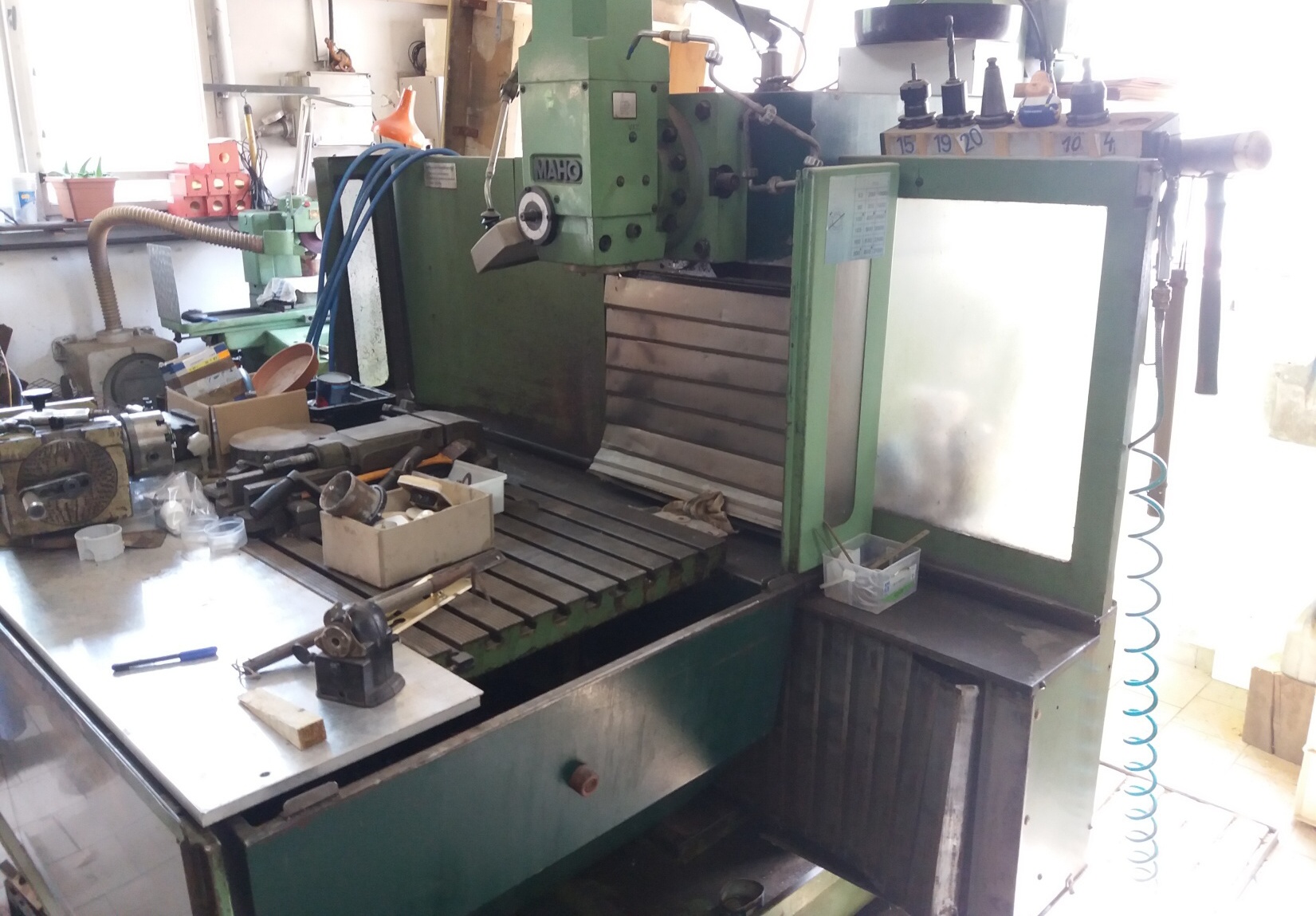 Kluci nechce někdo od kličkařů, co sou totál otupělý a neumí dělat na cnc jedno maho docela v ucházejícím stavu, teda krom prachu na tom usedlýho, tak to má i před nějakým tím pátkem go dc serva, myslím, že bylo přidřené ložisko a shořel motor osy z, ale dělal to servis, musím dopátrat podrobnosti, ale hlavně to nejelo už hodně let v osmi hodinovým nasazení, ale dost sporadicky, když to někdo přišel naprogramovat. Moc vo tom nevím, maximálně to zapnu a budu na to čučet jako puk,ale s přivolanou příslušnou osobou se to i spustí na práci, akurád se musí před tím trochejc uklidit. Příslušenství jako frézy, upínače, centrikátor a dva svěráky jsou samozřejmostí=je to rovnou na práci,samo po vycídění a asi max výměně hydrolu, samo že to trochu ofučíme a votřem, cenoffka tak nějak kúlem 85TCk, stojí to u Domažlic v kolegovo dílně