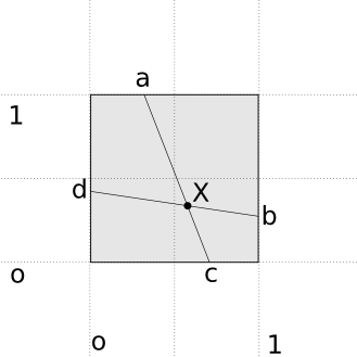 velice jednoduse udelas si rovnice primek (coz se da ze dvou bodu krasne udelat) a ty pak das do rovnosti (v zasade mas dve rovnice o dvou neznamych X a Y bodu se 4 parametrama a b c d ) to se da pak na pc pekne resit.