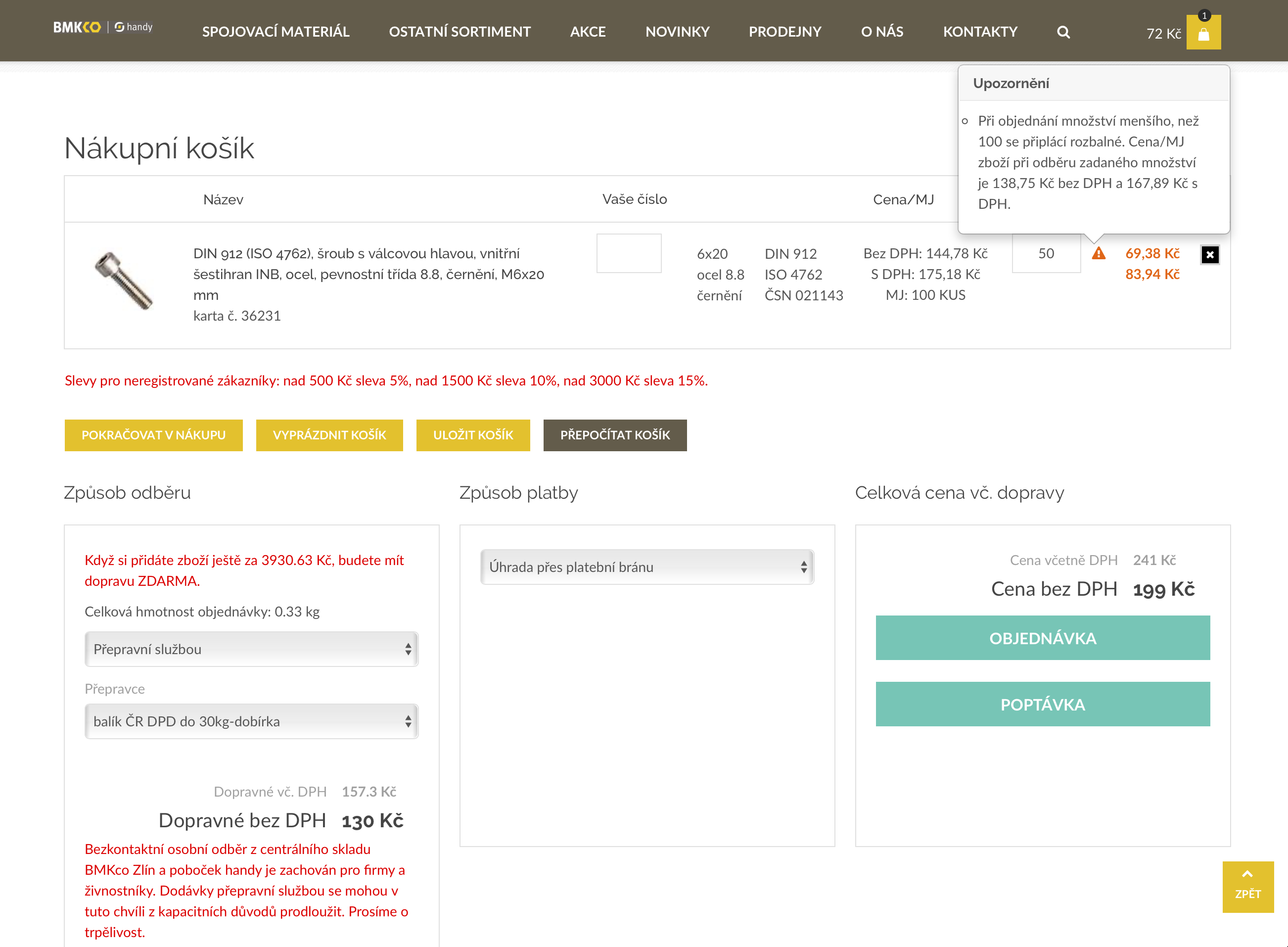 Koukal jsem asi do tří faktur z posledního roku a nikde to nebylo, i když jsem bral třeba 20 ks a krabička byla 100 ks. Myslím, že to tam mají na obranu před prudiči co by objednávali 4ks matice M6 / třeba /. I když ty umravní již poštovné.