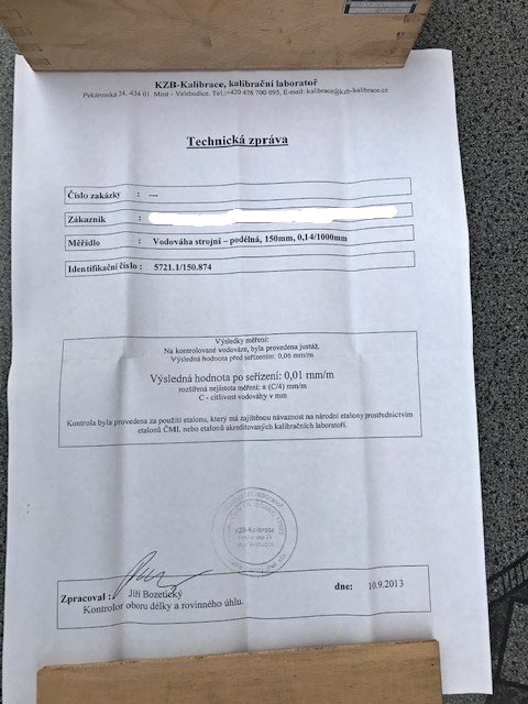 Já ten protokol chápu tak, že před seřízením to bylo na otoč těch 0,06 a po seřízení 0,01 rozdíl. tj posunutí bublinky o ,3 mm. Ale nakonec se kluci dohodli, obchod proběhl a kupující ví, že má váhu kde jeden dílek dělá 0,14mm/metr, což jest cca 0,02 mm na délku váhy. Jen tak na okraj, při měření váhu raději otáčej a měř v obou směrech a výsledek zprůměruj, pokud ukazuje rozdílně. Nebo zkalibruj. Pokud máš něco stabilně vodorovného, není to žádná věda. Chce to jen trpělivost, přikrýt váhu nějakou krabicí, jinak jde bublina za světlem.