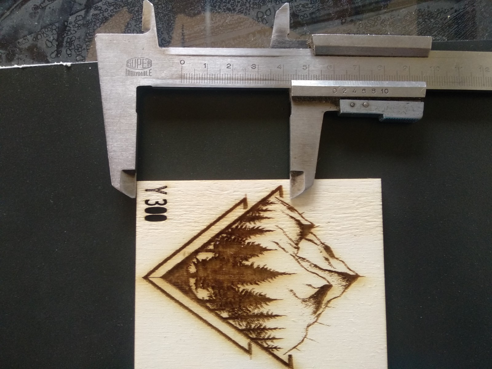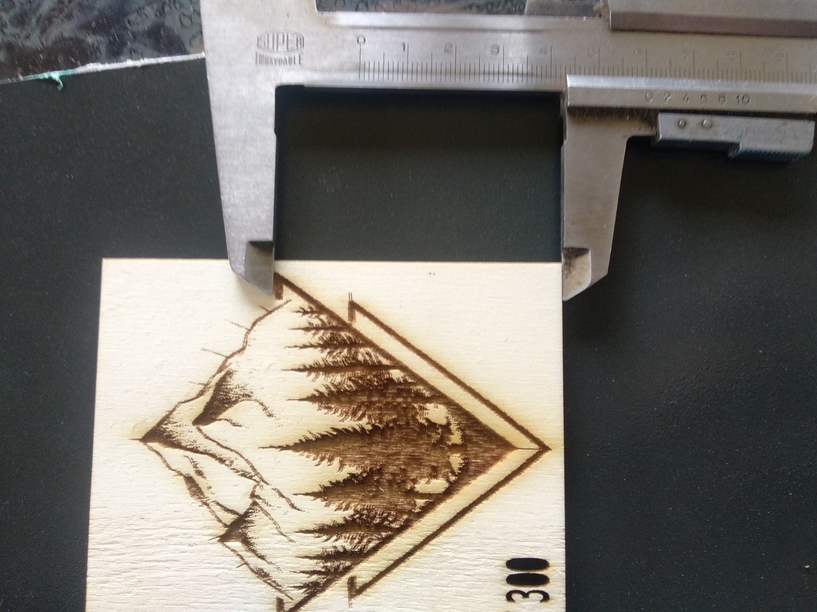 Použitá rychlost pro gravírovaní byla 300 mm/s a 100 mm/s (výsledek vždy absolutně stejný)