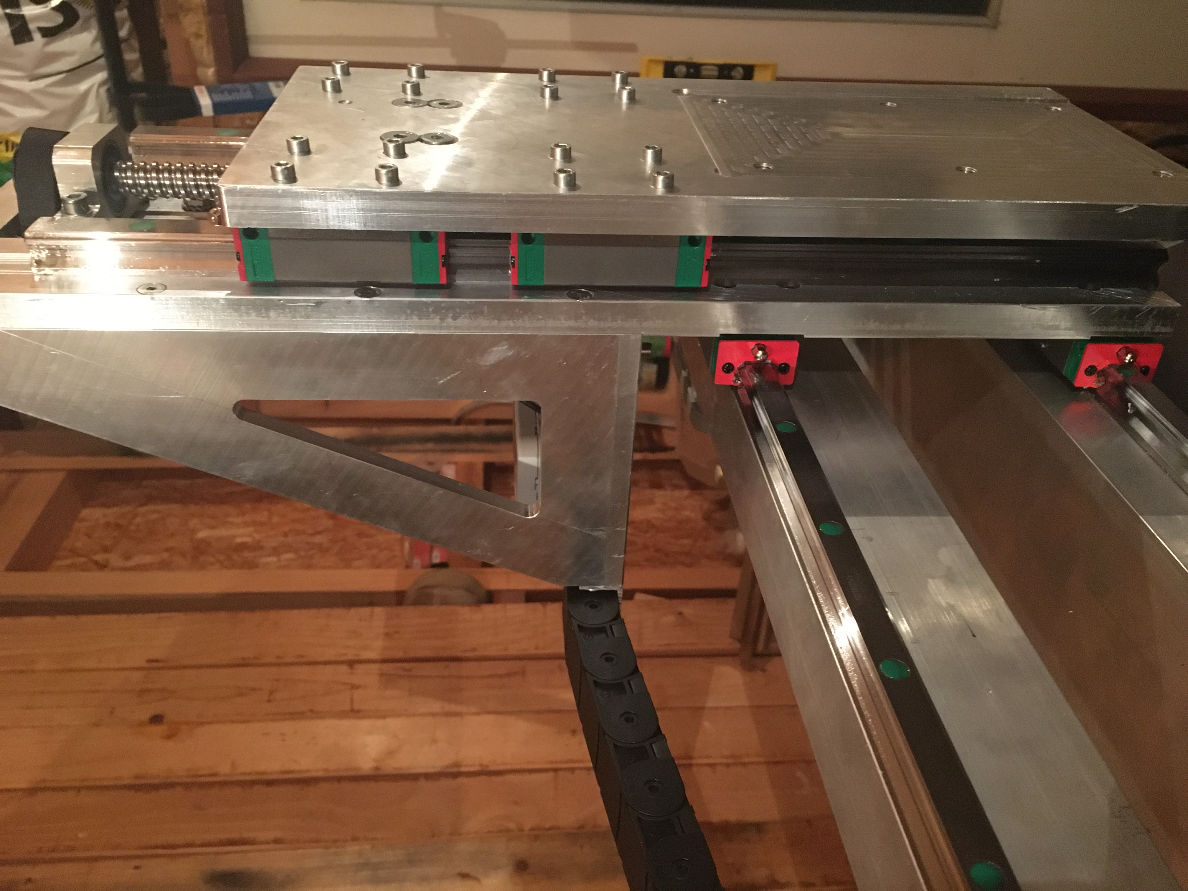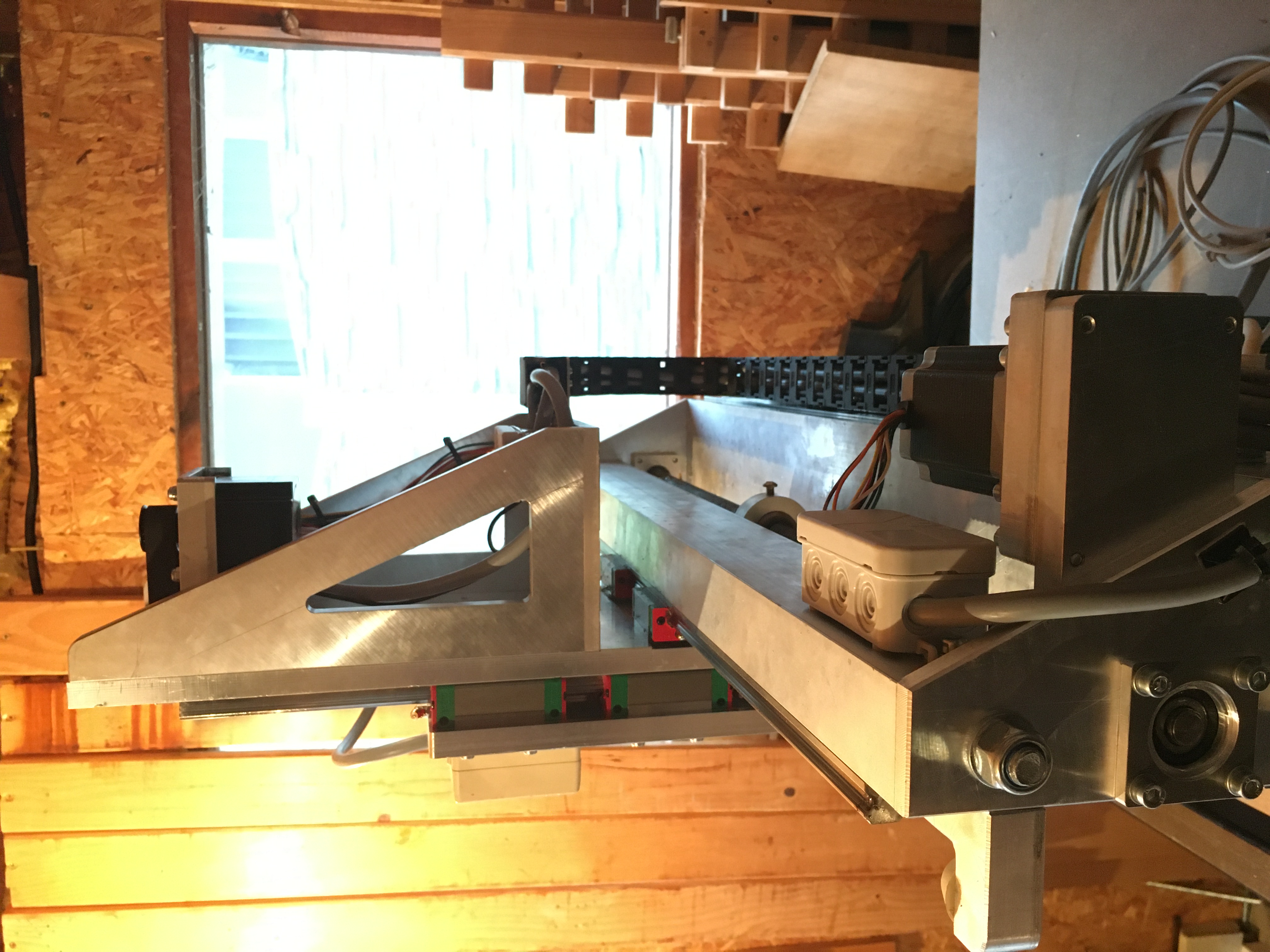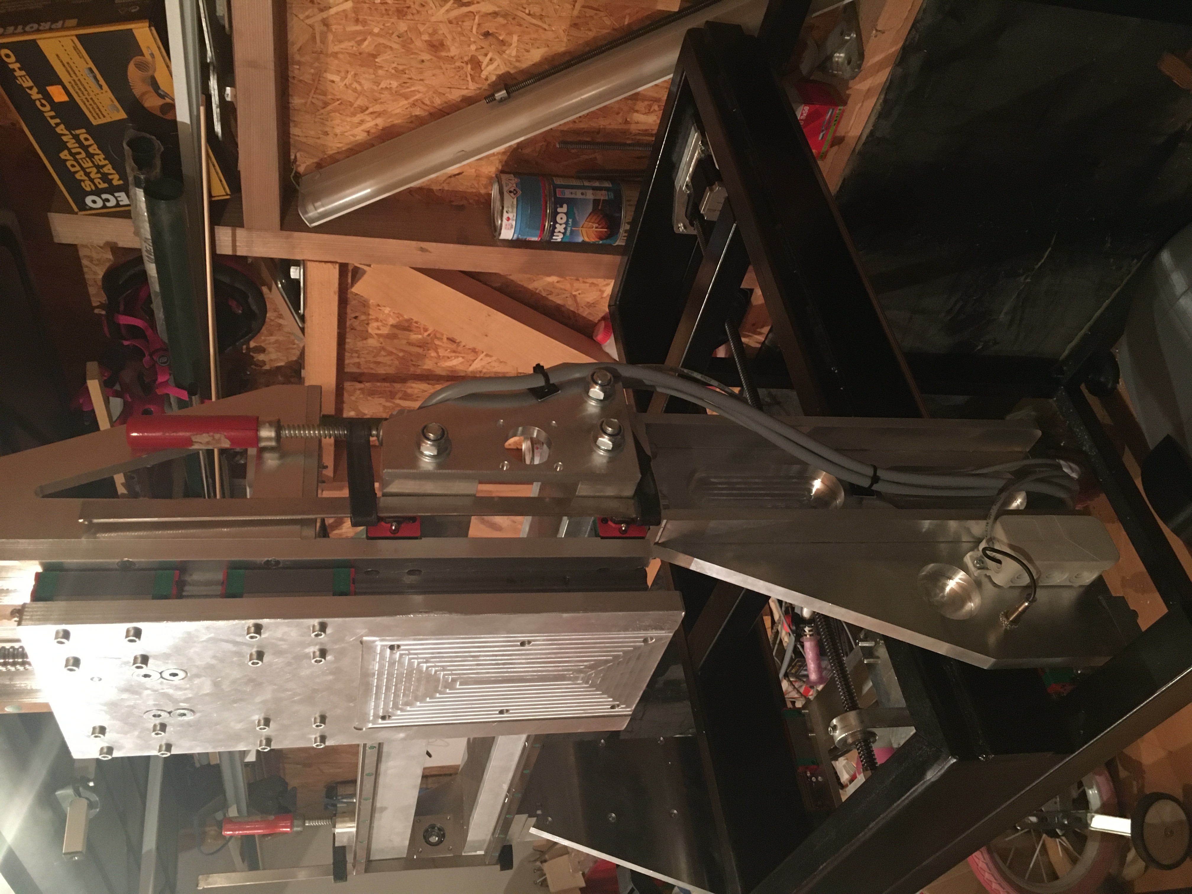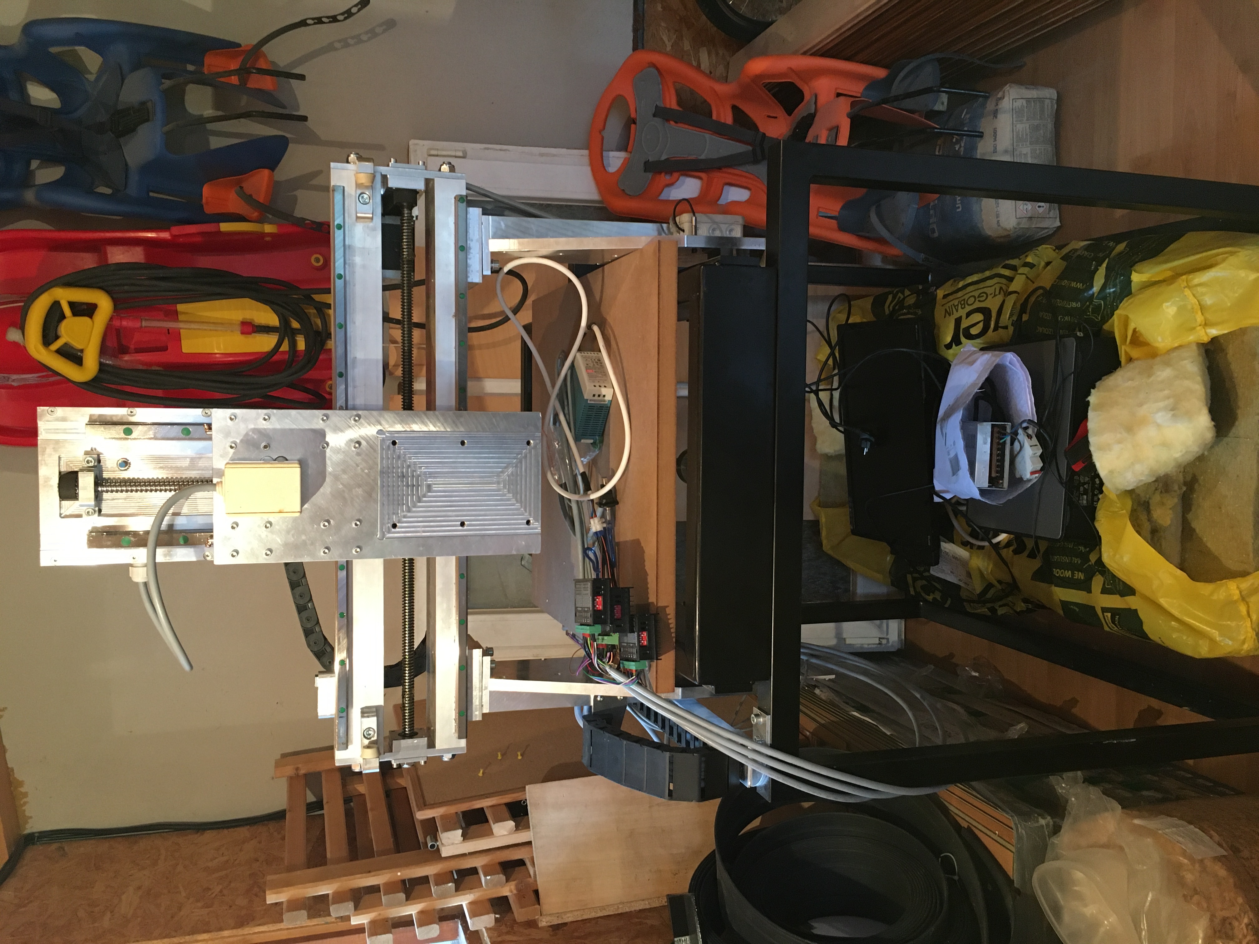 Prodám rozestavěný cnc router. Základní rám železo, zbytek hliník. Rozměry š.800, d.1000 a v. po stůl 1040, celkem 1740. Obráběcí plocha 700x500x200. Výškově stavitelné nohy s gumovou podložkou, kabely nataženy v kabelových řetězech a zapojeny k motorům a ind. snímačům. Indukční snímače na kalibrování, lineární vedení hiwin. Osa Y trapézový šroub 16x4 a krokový motor Microcon sx23 2727 přes řemenici, osa Z kuličkový šroub hiwin stoupání 5mm a motor Leadshine 57HS09 také přes řemenici, osa X pouze ložiska na koncích a domek na motor, ale zatím bez šroubu a motoru. Zamýšleno na připojení arduino uno s cnc shieldem. Foto mailem. Cena 15000kč