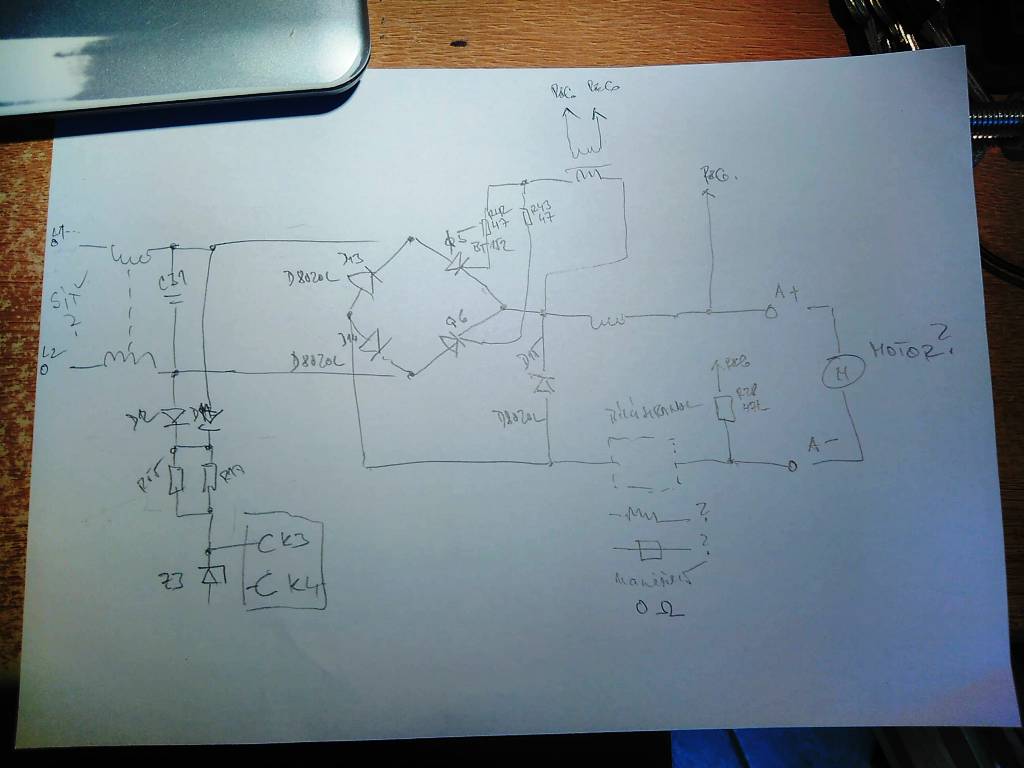 tak první zkoumání obkreslil jsem z desky schema výkonové části, je to řízený tyristorový můstek, 2x BT152 a 3x D8020L