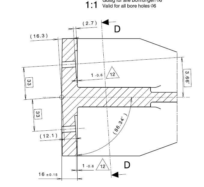 1) Tělo které prochází menší dírou D6 by měl mít 5 až 5,5mm a ostří délku 28mm