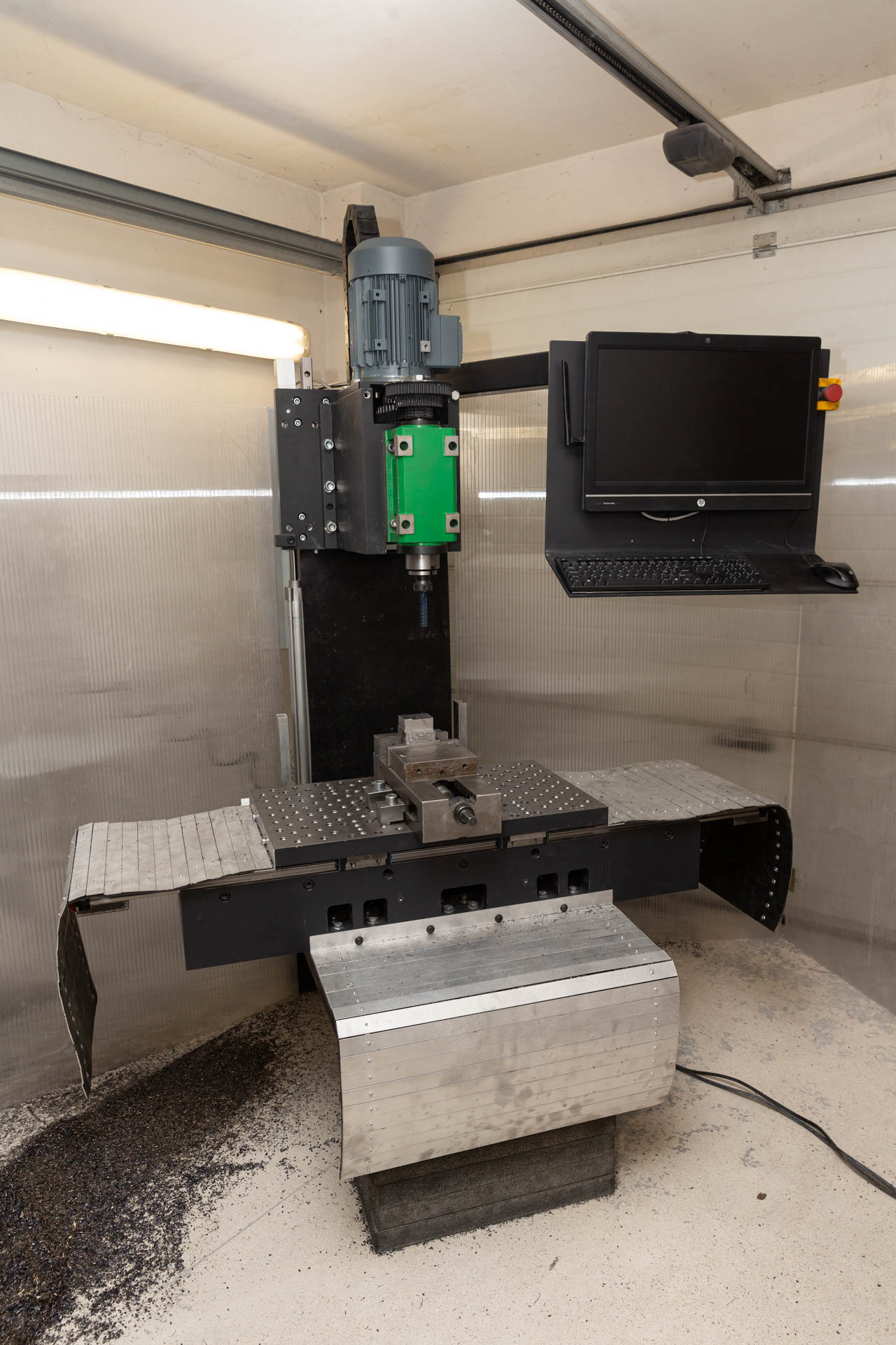 Rozjezdy 600x400x500mm. Otočný vřeteník. Montovaná ocelová konstrukce. Rovinost pod 2 setiny na celé délce. Vřeteno BT40, 3. st. řemenový převod, max 50Nm s 3kW motorem (bohužel nemám 400V a tak to je maximum co mi udrží jistič). Po otočení vřeteníku lze brousit na plocho a teoreticky i na kulato. Mám i obrážecí hlavu. Váha cca 1,5t. Výška do 2m aby vešla do mé garáže. Pohony EasyServo 12Nm, řízení Mach4.