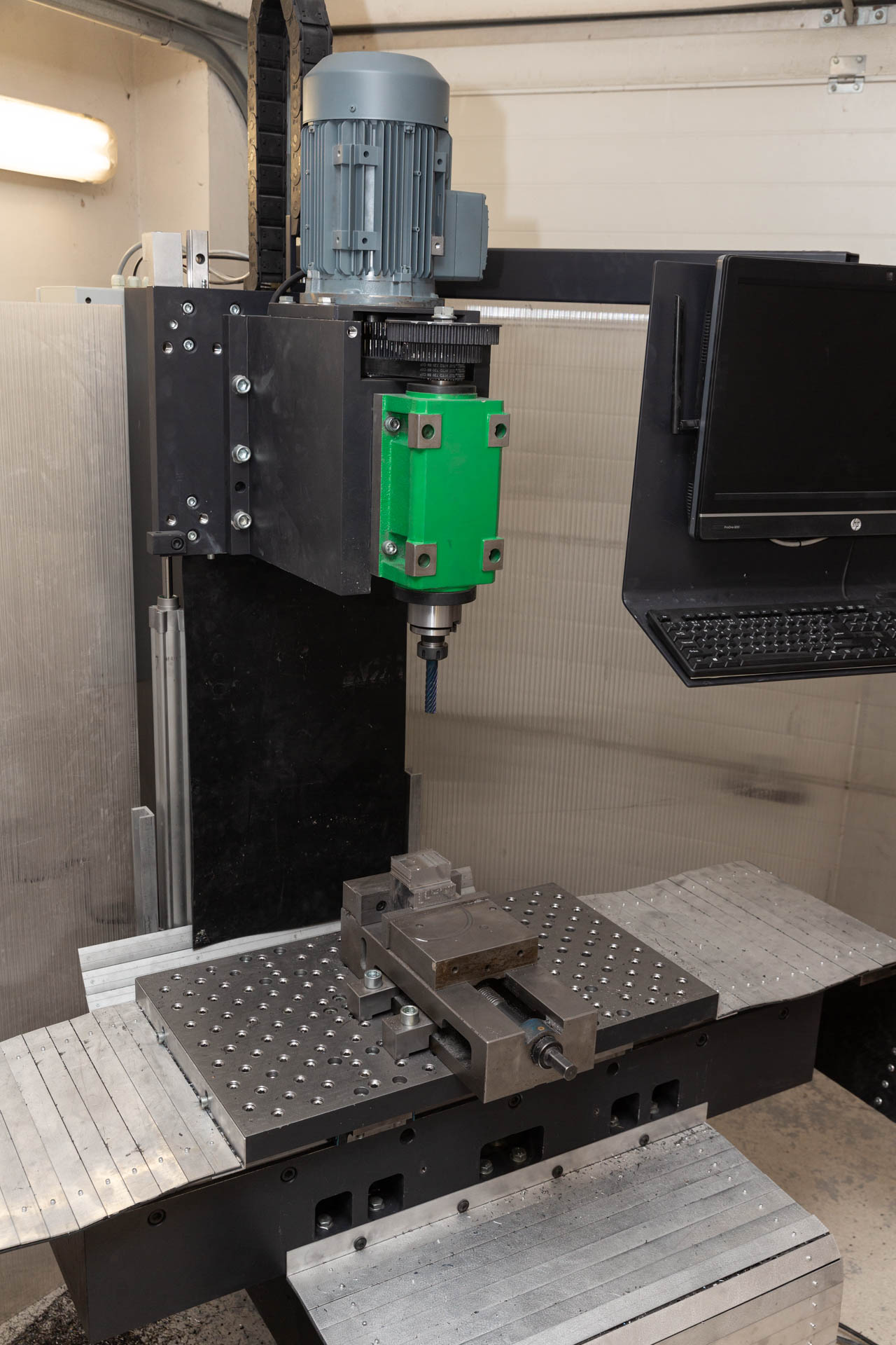 Vřeteno je ale otočné, jen má kratší šroub, tak nesjede tak nízko ale o 50mm výš. Rozjezdy jsou dokonce větší, tedy 650x400 a v Z jen 450mm. Vřeteno má obyčejné "japonské" ložiska a podle výrobce to umí 8tis otáček. Já mám dovoleno jen 120Hz což je na nejrychlejším převodu 7000ot. Na hliník s pak přehazuji elektorvřeteno 3,5kW 18000ot. Je to ale na prd, protože to musím vždy seřizovat. Mám tam sice dorazy, ale ty jsou na úhel 90st a na vřeteno nemám.