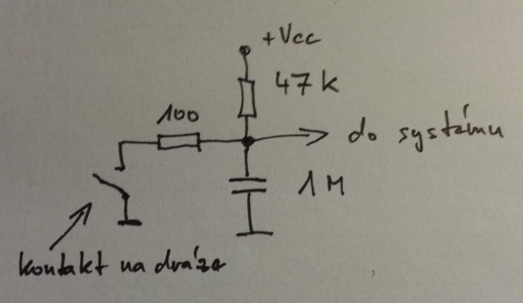 Tím máš kontakt ochráněný, a teď můžeš zkoušet zvyšovat kapacitu toho kondenzátoru, dokud to nepřestane kmitat. Ten pull-up (na obrázku jako 47k) tam nedávej, zkus použít jen ten pull-up, co už je na vstupu té elektroniky.