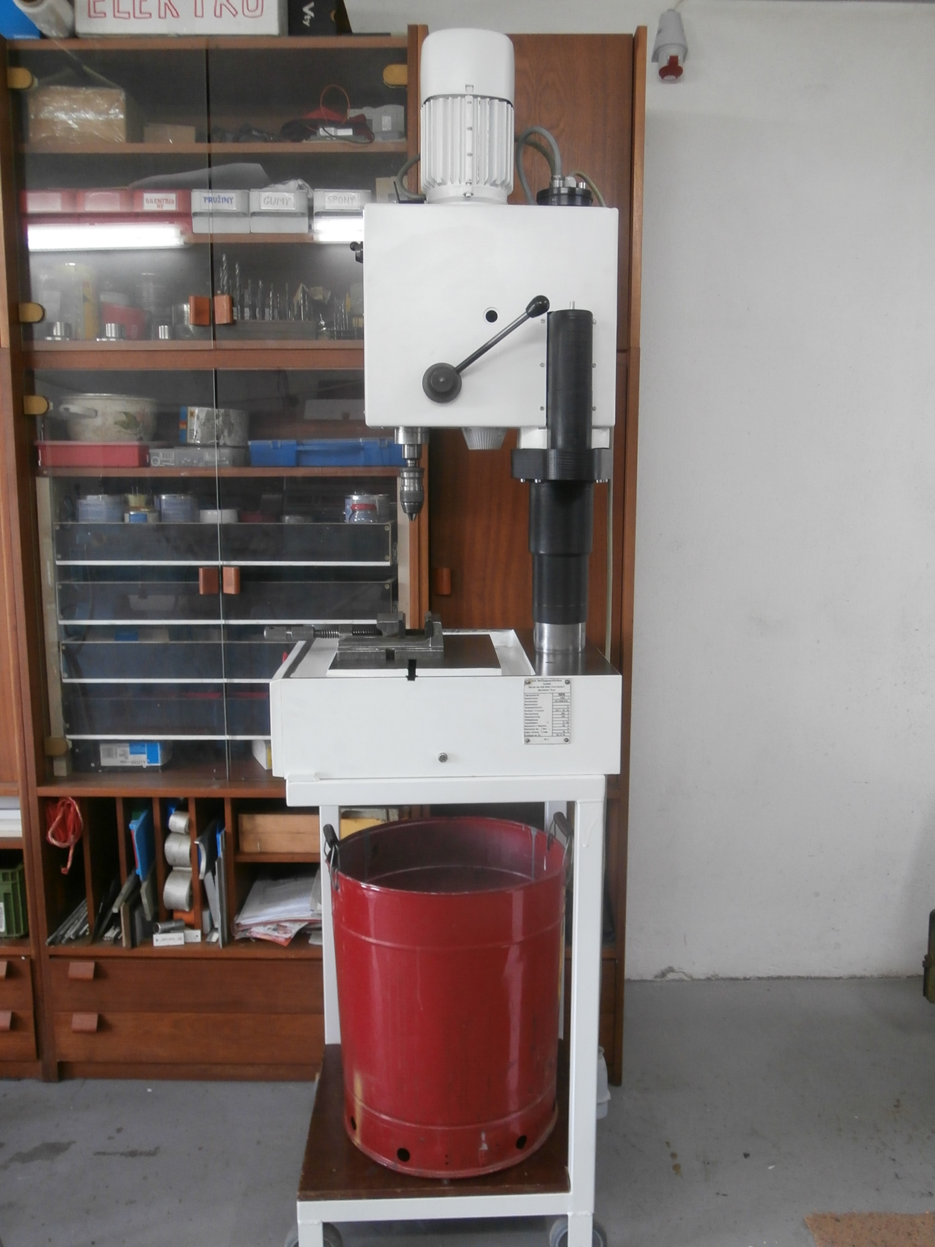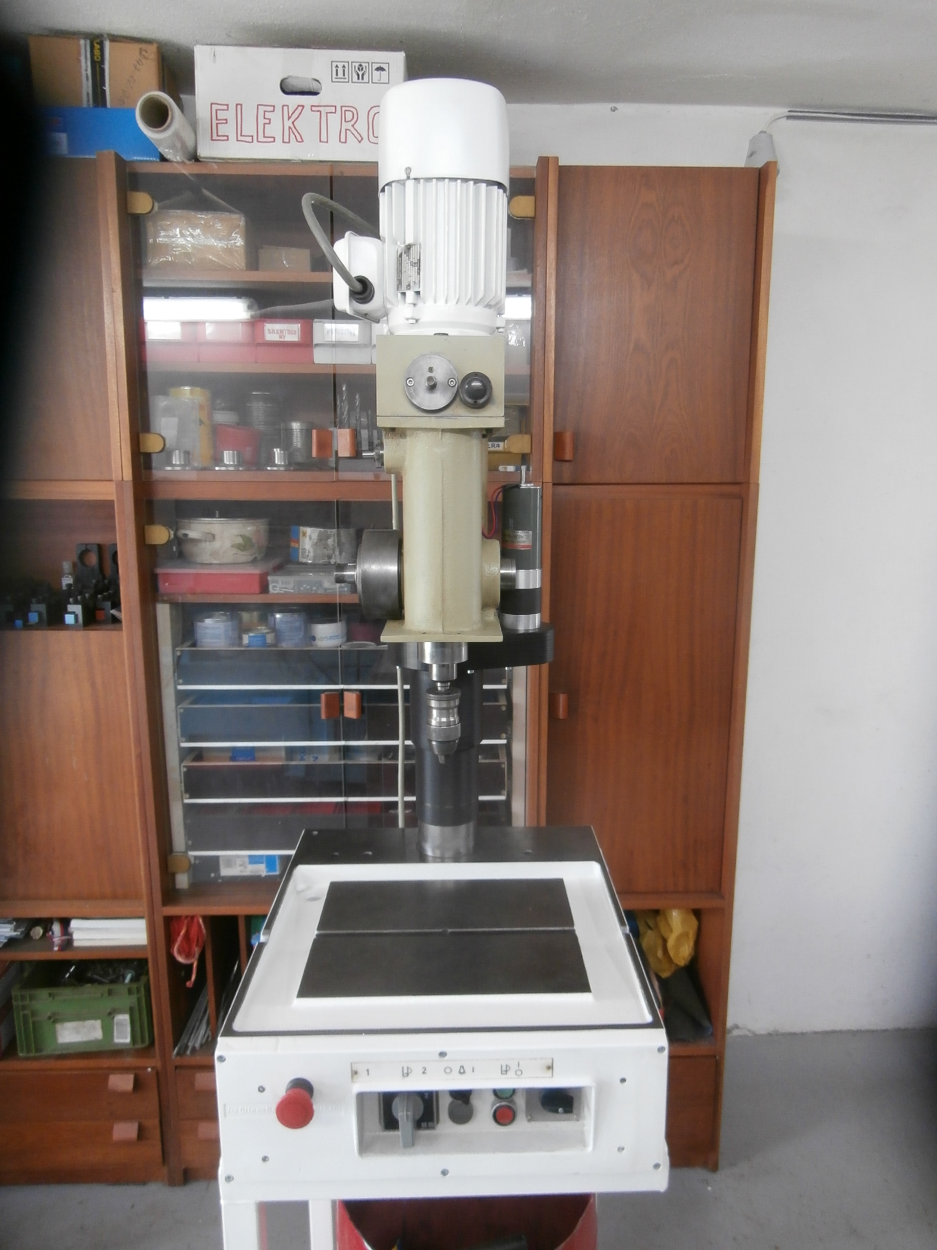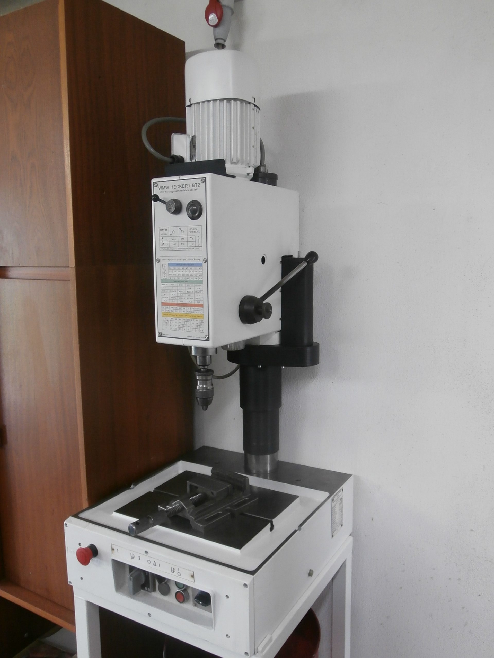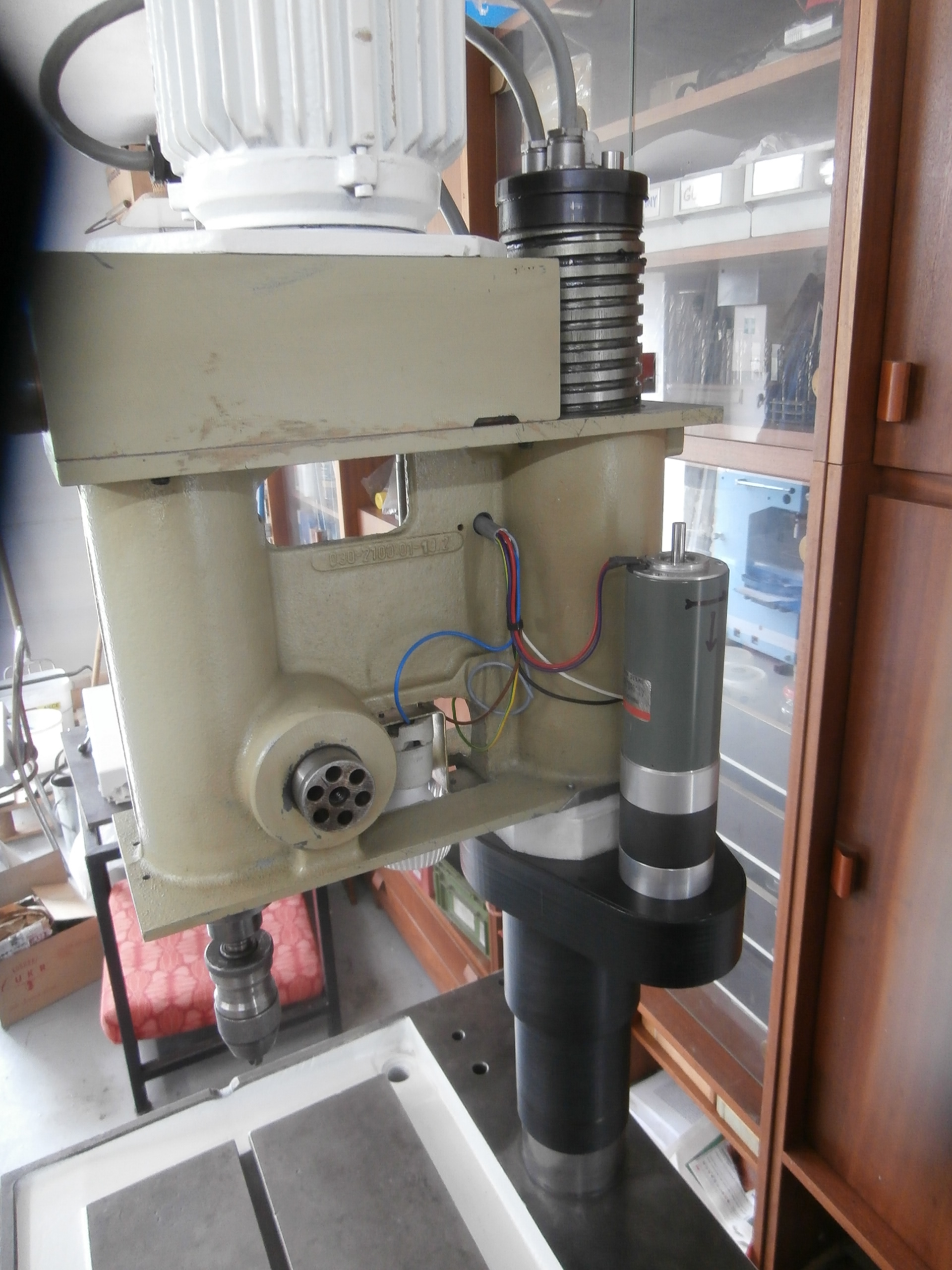 Celý agregát vřeteníku jezdí po sloupu na němž je závit a přes matku se spouští dolů nebo zvedá nahoru. Jenže to se člověk natočí tou matkou, a to se mi zase moc nezamlouvalo, tak jsem pohyb vřeteníku v ose Z rozšířil o pohon elektromotorem