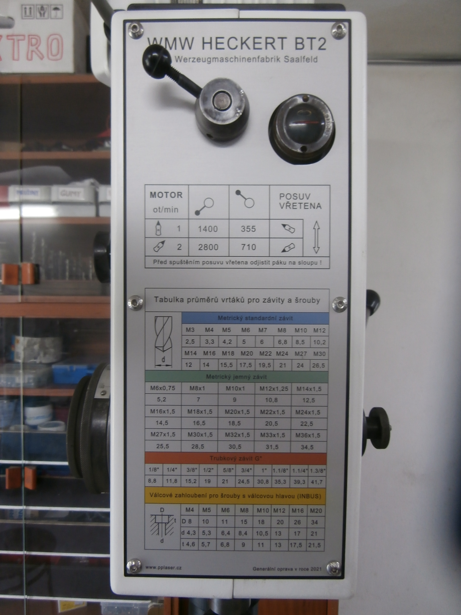 Strukturu pohonu tvoří dvouobrátkový elektromotor 2850/1450 ot/min + převodovka. Dohromady má tedy 4 rychlosti otáčení vřetena, změnu otáček lze provést velice rychle, buď pákou převodovky nahoře, nebo přepínačem otáček elektromotoru na ovládacím panelu.