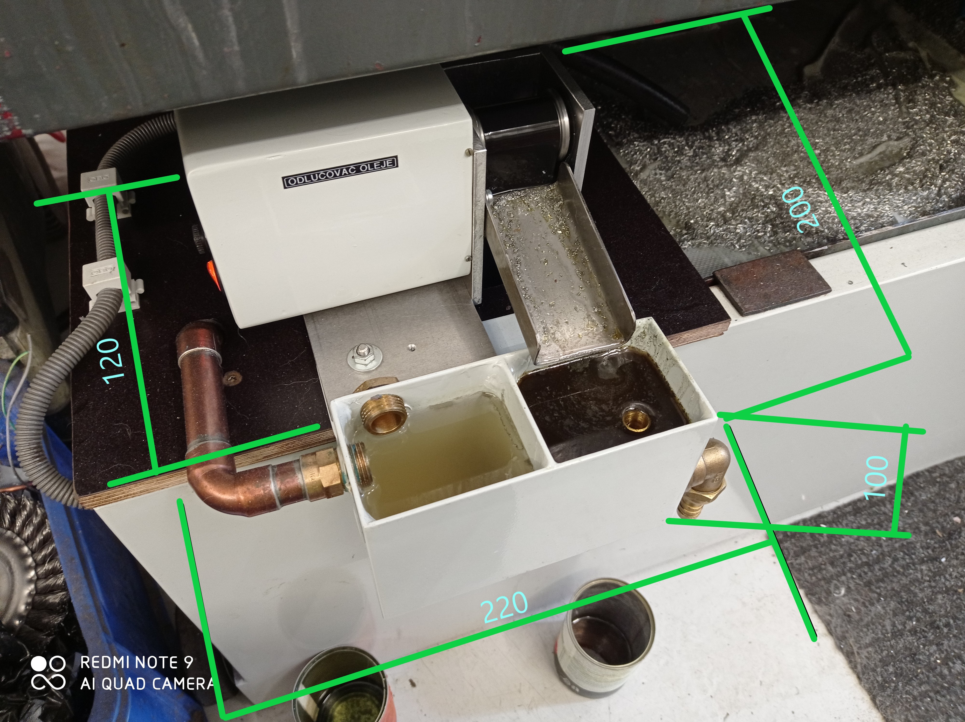 Zdravím. Dali jsem dohromady vlastní odlučovač oleje z emulze. Pokud by někdo měl zájem mohu vyrobit další. Funguje to dobře. Ten vývod navíc je jen ucpávka. To víte, vývoj