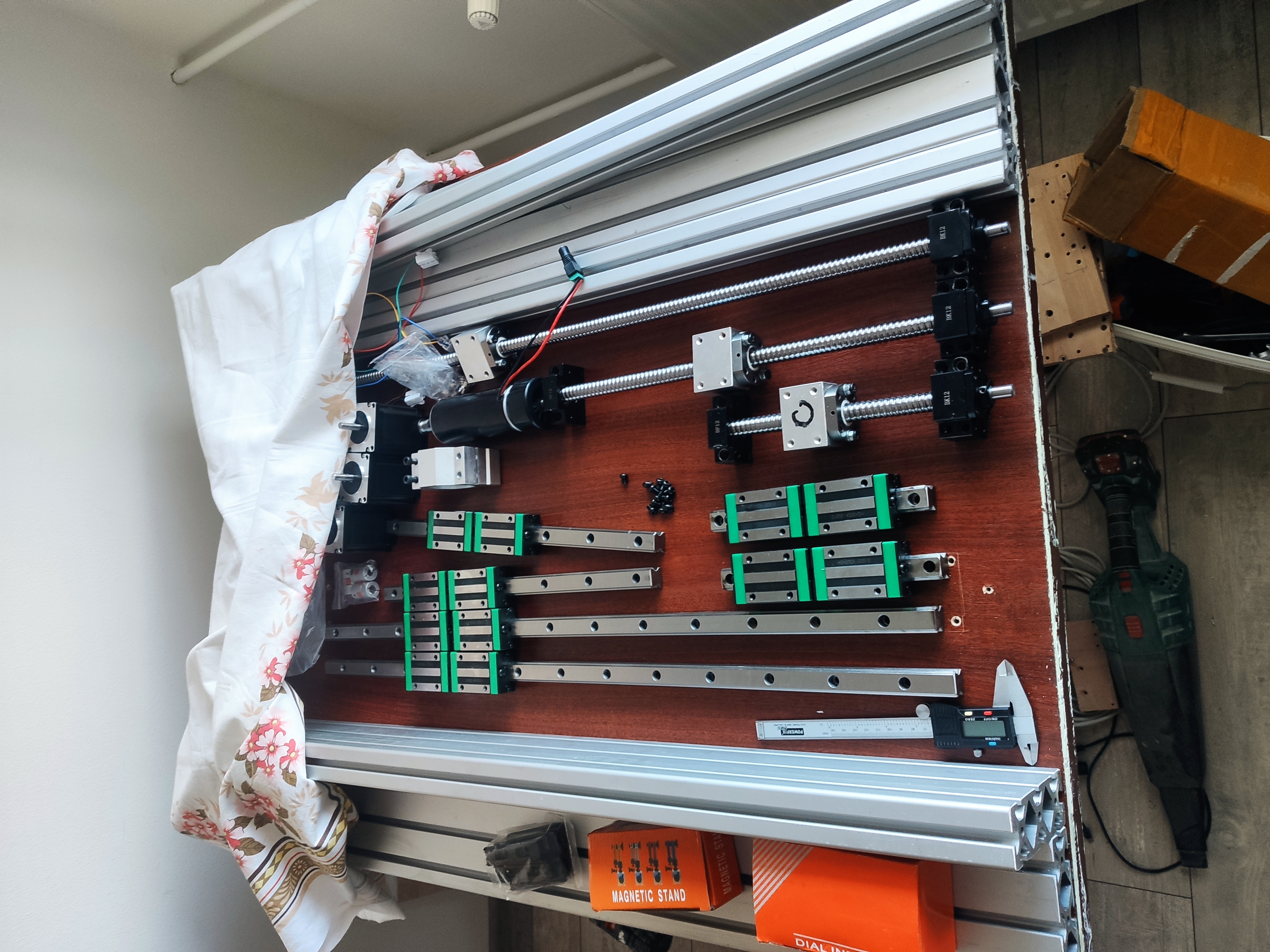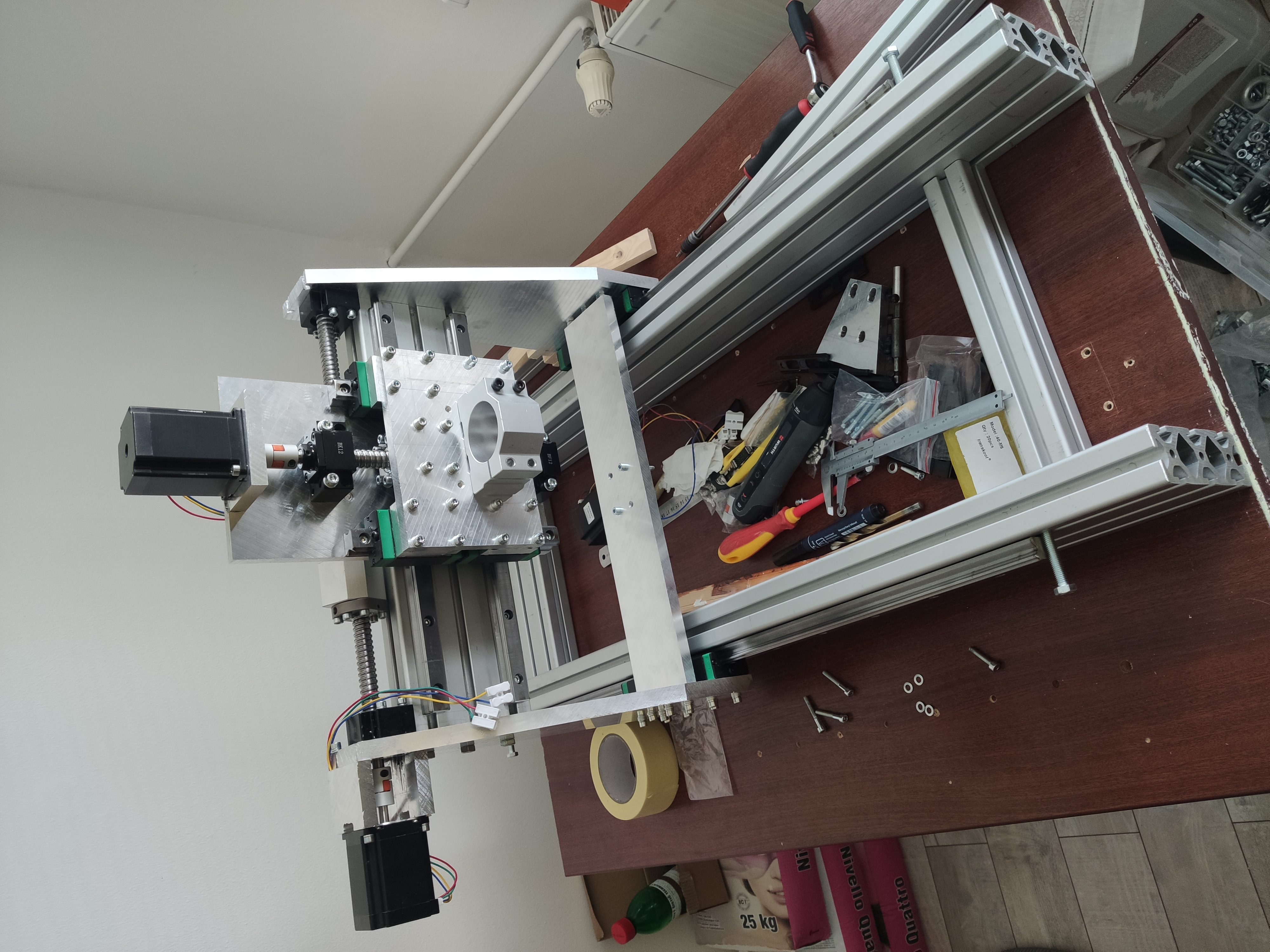 Ahoj, ak som sa cez arduino následne 3d tlač 2d lejzrovanie dosal až k aliexpress fréze. vetšina dielov z aliexpresu hliníkové profily od známeho známeho a hliníkové dosky od slovenského predajcu. diely boli postupne kupovane a postupne podlá rozmerou predajcu modelovane v sketchupe(rýchly jednoduchý) aby všetko sedelo. Po zložení som postupne nahrádzal elektrické diely z arduina som prešiel na nvcm v2.1, 24v zdroj na 36V, 500W spindla sa nedala ovládať pwm signálom tak som skúšal paralelne ovládanie mosfetu pomocou arduina a samozrejme som zhodil hlavný istič a mosfet odpálil a musel čakať kým z činy dorazí novy. Ovládanie je cez mach 3 ešte ho nemám kompletne nastavený ale časom sa k tomu dostanem. Drivery sú najlacnejšie TB6600 ktoré sa rady prehrievajú takže sa mi stáva že mi náhodne prestane íst os a samozrejme ostatne otom nevedia takže veľa zničených nástrojov momentálne očakávam nove 3x DM556 4tú os nechám na starom. Dovod preco som sa odhodlal pre stavbu je ze na aliexprese som našiel výhodnú cenu lineárov a dovoz z CZ. Plocha na opracovávanie je 240x640x45. Z dôvodu spolunažívaní v panelovej bytovke som musel pristúpiť na stavbu finančne nenáročného a nepekného kurníku vyplnenú sklenou vatou pre frézu a polozil som ju na izoláciu pre vodovodne trubky aby sa ani zem netriasla. Zvuk izoluje pekne no teplo bohužiaľ ešte lepšie takže potrebuje sem-tam vyvetrať.