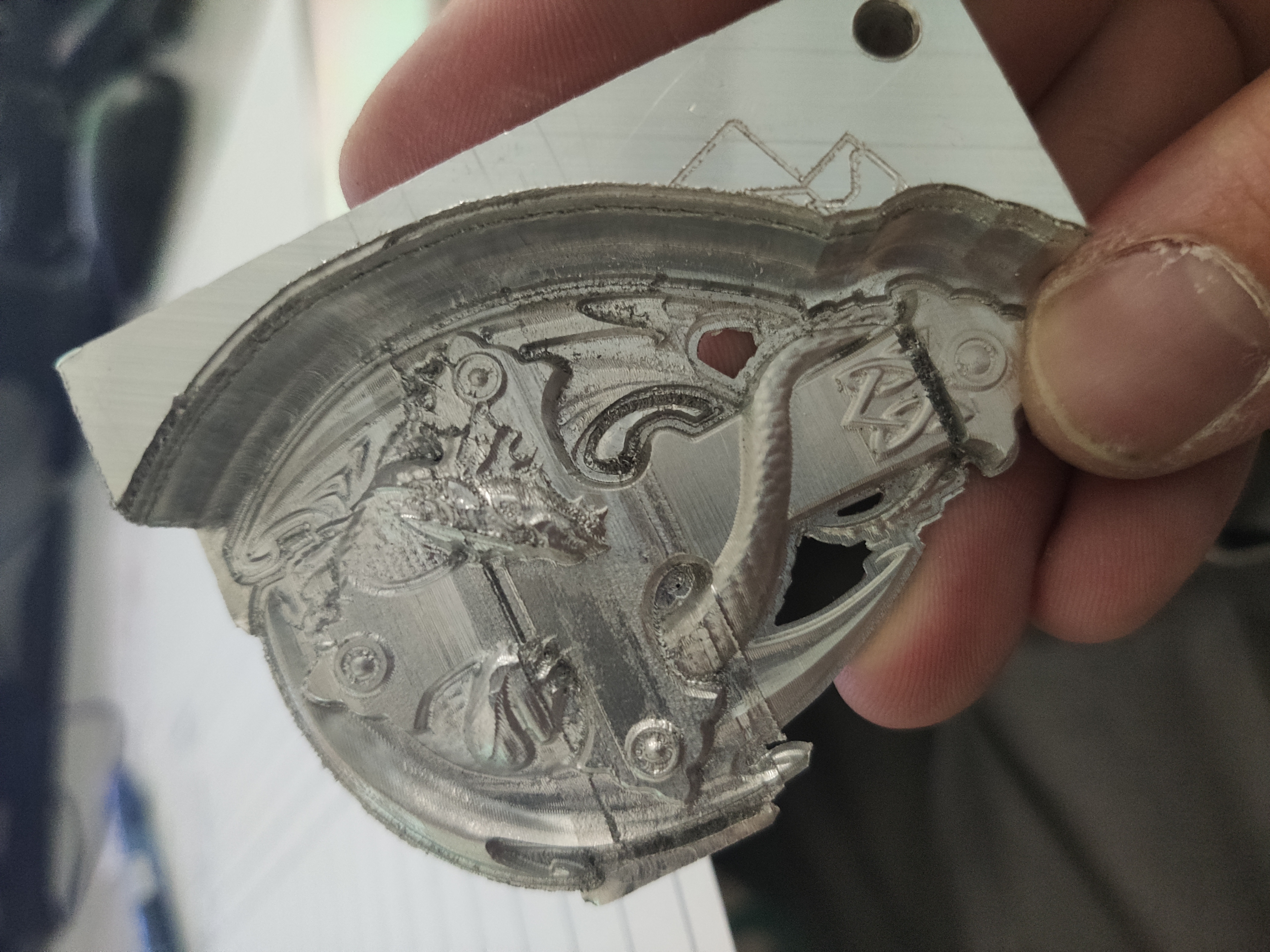 Manželke to nevadí veď som jej ako prvé vyrobil nádobku pod mydlo(to je tá drevená vec na fotkách). Horšie to bude keď budú deti a budú spať to už budem mať asi zakazované. Ešte som skúšal hliník čo mám odrezky z dosiek 5083. Tu mi v dolnej časti odišila Z os takže frézka šla pekne cez obrobok + v polovici a 3/4 sa zlomil nástroj a netrafil som výšku.