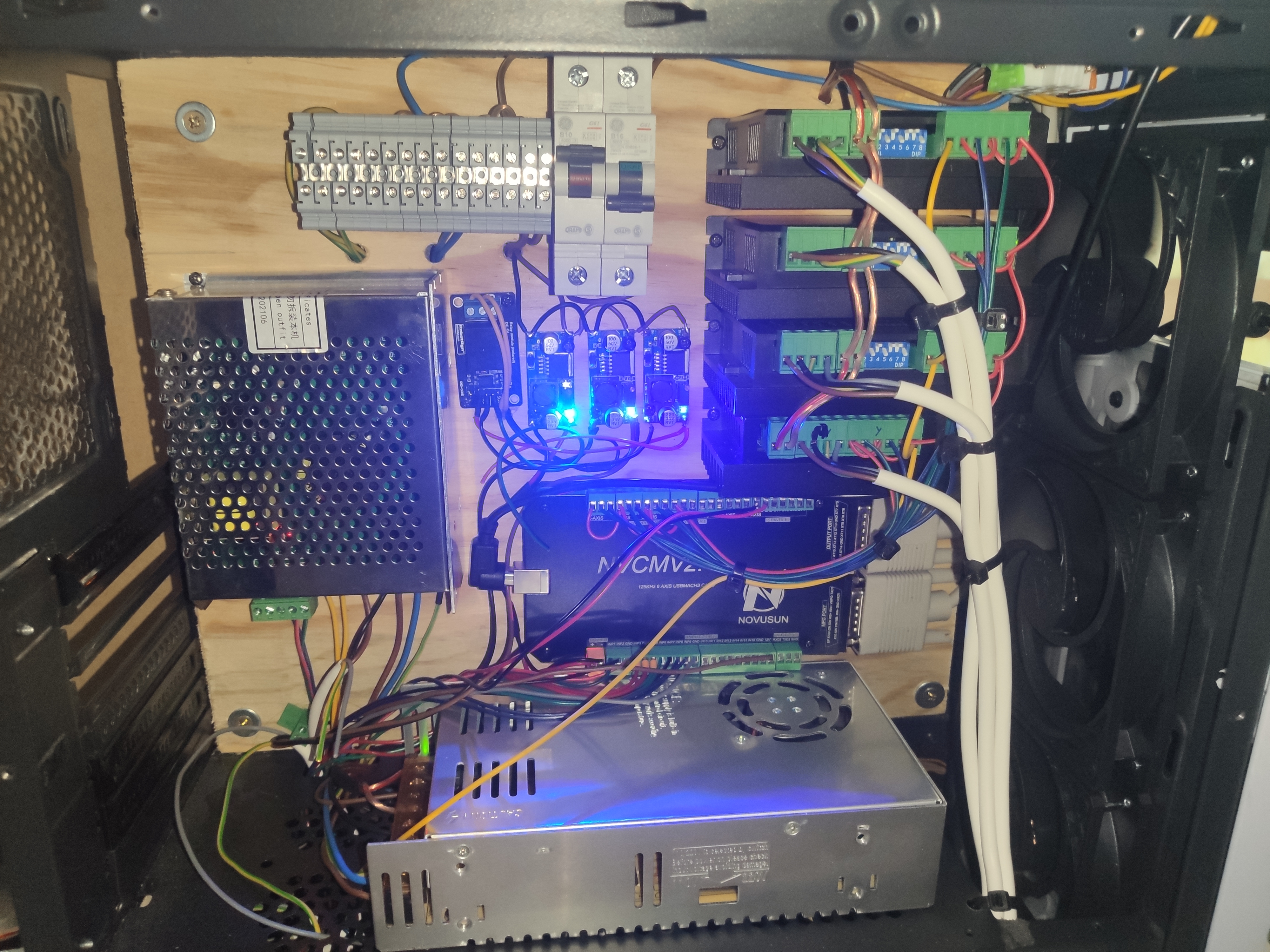 Elektronika uz prehodena, pridane led svetlo, nove drivre DM556 sa uz neprehrievaju motory niesu pri pohybe skoro ani pocut a po prehodeni z 6400 krokov na otacku na 12800 su uplne tiche jeden driver TB6600 ostal pre 4-tu os. Analogove riadenie vretena 0-10V sa mi nepodarilo rozbehnut bud som dostaval iba 10V alebo iba 0. Chcel som potom aspon spinaciu slucku menica nastavit cez 5V rele a ako spinanie pouzit vystup pre smer otacania vretena no z neznamych dovodou mi to stahuje napatie na 2V a nezope rele. Pre nulovanie nastroja osi Z som pridal 12mm dosticku pre probing, na na youtube som nasiel nastavienie takehoto nulovania z programom pre mach ktory bolo treba uravit nakolko po dotyku sa os zastavila a potom sa este rozbehla este 10mm dole nastastie som nemal nastroj upnuty napevno iba ho zatlacilo do sklucovadla. Momentalne este cakam na zavitove vlozky do dreva. Este je jedna taka nevyhoda tohoto NVCM riadenia je ze rozsah napajacieho napatia je podla dokumentacie 12-32V no pri 12V riadenie nerozozna vstupny signal takze je tam cez regulator pustenych cca 25V. A vystupne napatie s popisom 12V neni 12V ale je rovne vstupnemu napajaniu.
