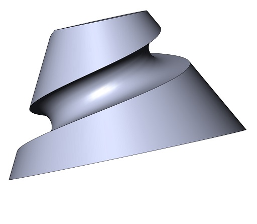V Solidworksu jsem použil stejné uspořádání jako má na obrazku bobik, kotoučova freza s osou rovnobeznou s kuzelem tazena po krivce, v tomto pripade konicke sroubovici. Podminkou v SW je, ze nastroj je konvexni teleso tvorene rotaci nebo extruzi konvexni skici tvorene useckami a kruhovymi oblouky. Osa muze byt orientovana libovolne, ale protoze se nemuze behem tazeni menit, vychazi tohle usporadani asi jako jedinemozne nebo jedine ktere me napadlo.