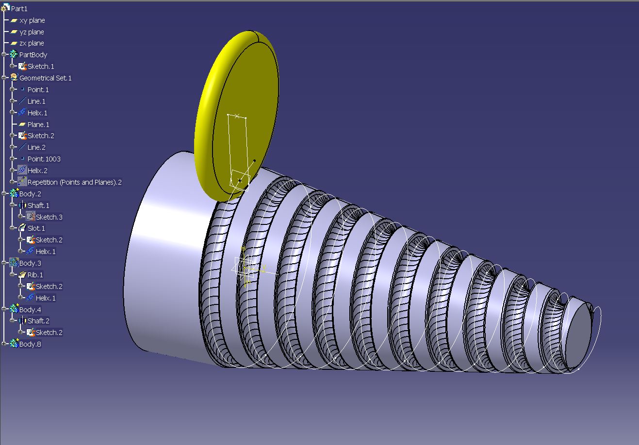 Oproti té fotce si tam přidej ještě tu kuželovitost a pokud možno i proměnlivou hloubku drážek, aby to opticky působilo dobře (jinak se bude s průměrem hlavně měnit i poměr mezi šířkou drážky a pole).