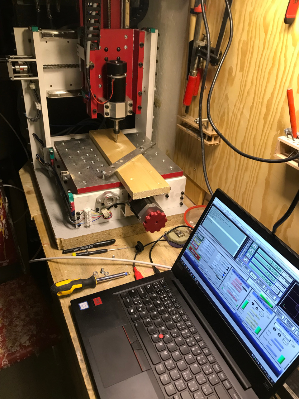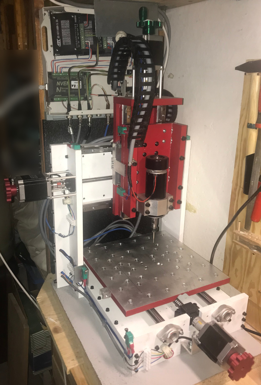 Elektroniku napájí zdroj 15V/22A, koupený od ID ne-moc (také ještě jednou díky). Drivery mají čip TB6560 (kupoval jsem je už dávno) a jsou nastaveny na 2A na fázi a mikrokrok 8. Oddělovací desku jsem tam původně dal obyčejnou (za 400 stovky s paralelním portem) a k tomu LINUX CNC, ale nechodilo to. Motory pískaly, drnčely, chodilo to fakt blbě. Nakonec jsem se odmítnul dál zabývat laděním hodnot motorů a zjišťováním, jestli mám blbou základní desku, SW nebo kombinaci obojího a koupil jsem NVEM board od Novosunu. A jsem fakt spokojený, na první dobrou to chodí dle mých představ a nemusím držet další comp ve sklepě. Prostě si přinesu notebook, připojím přes ethernet a pracuju.