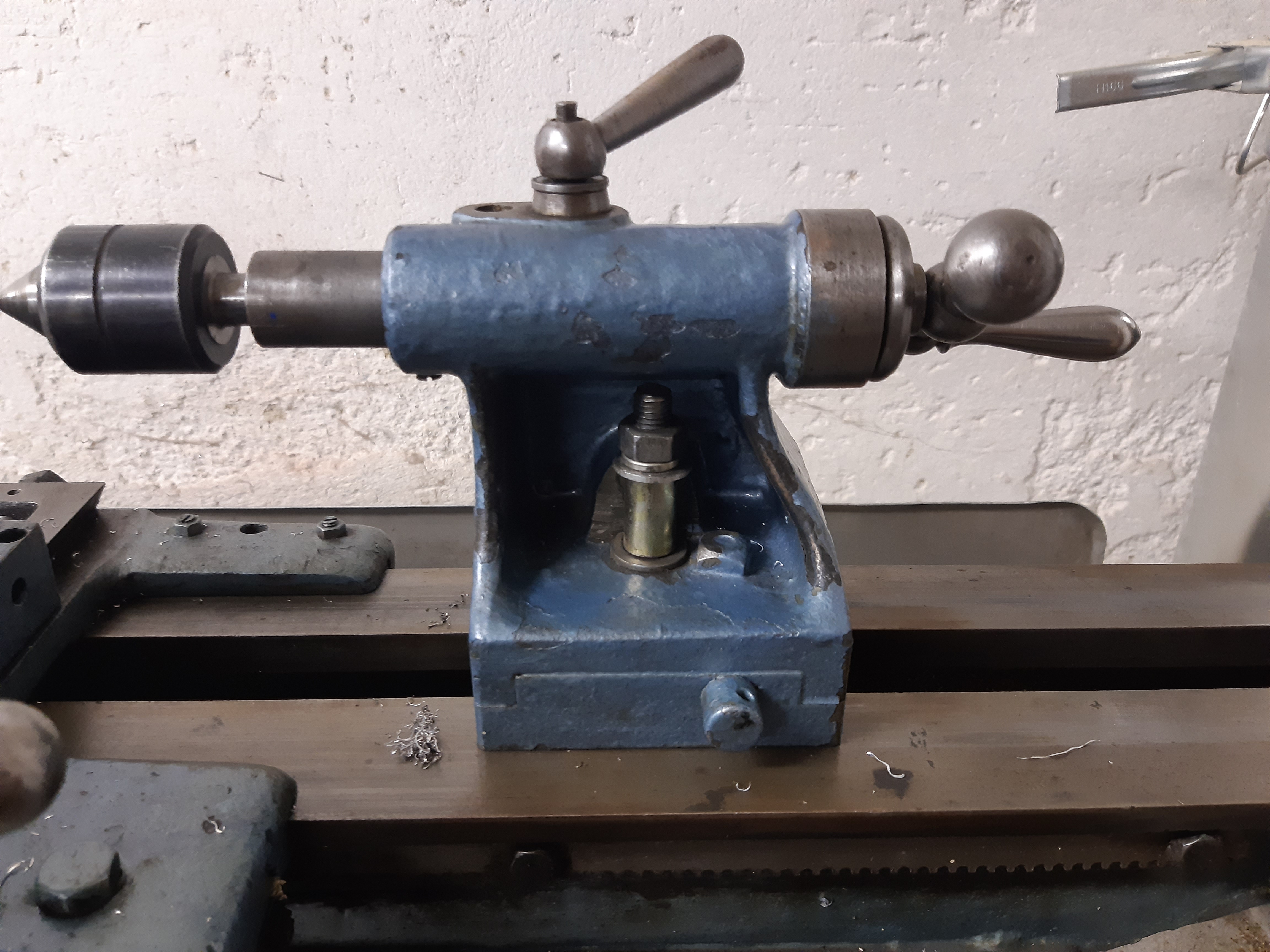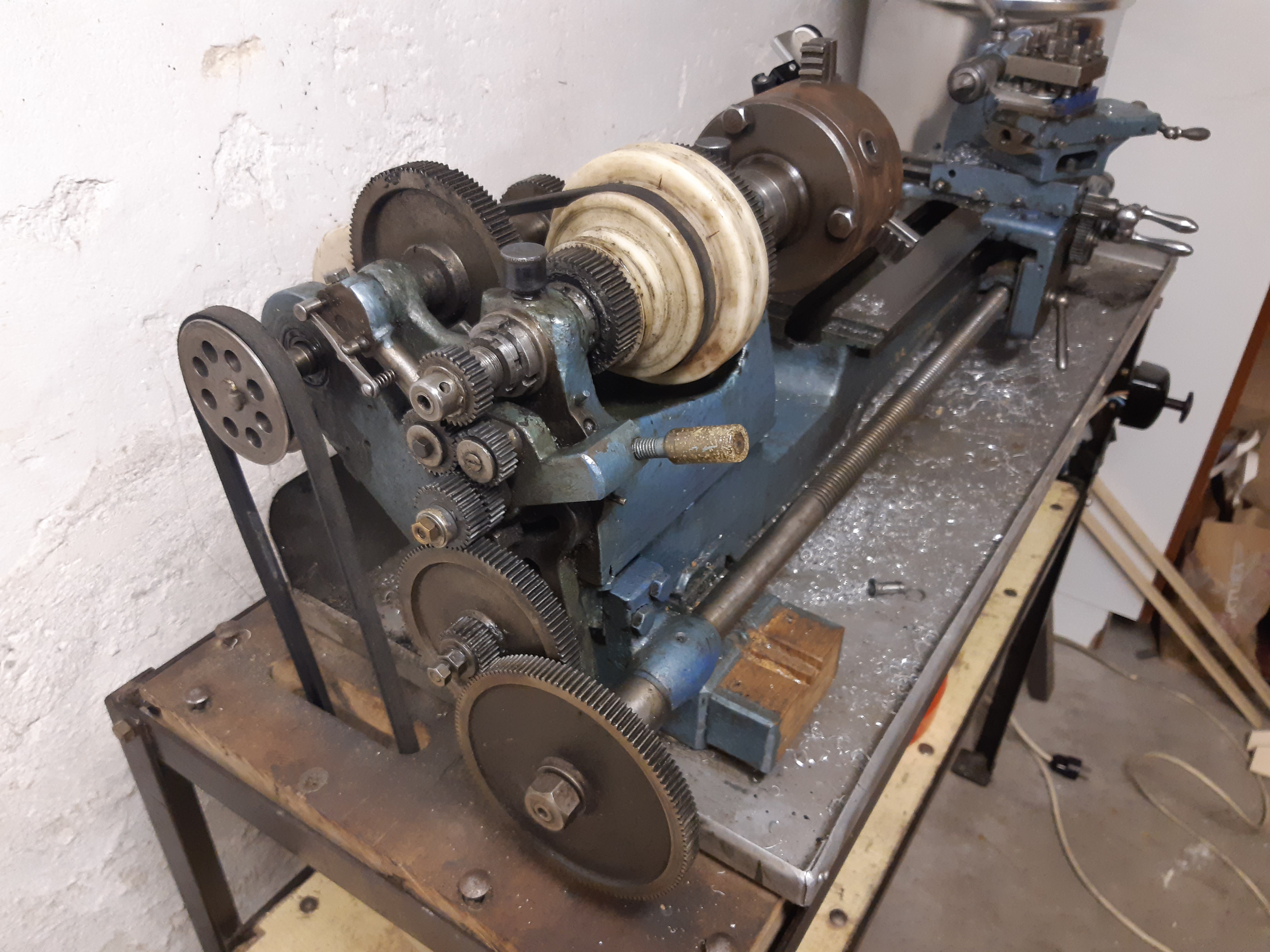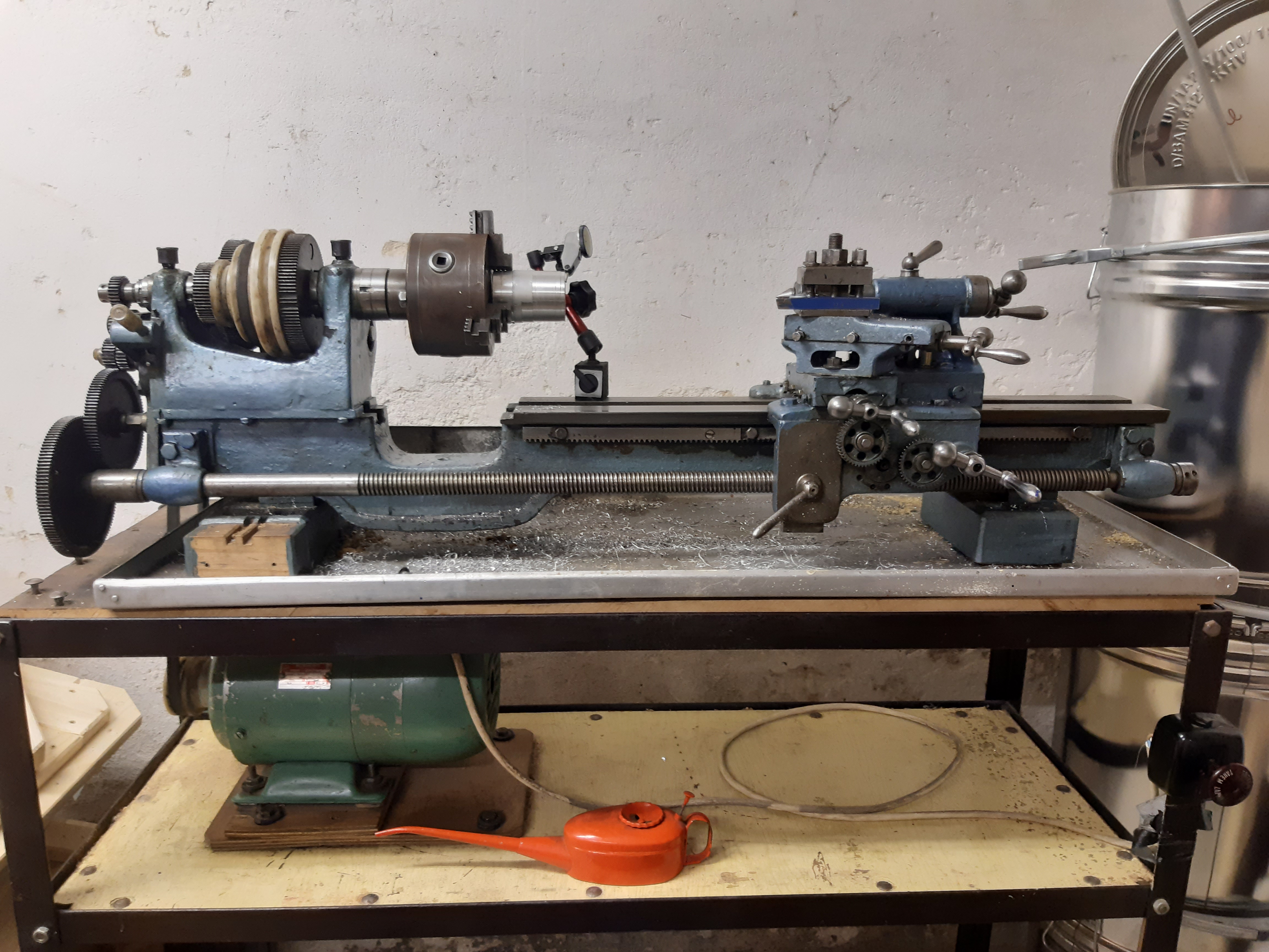 Jedná se o menší stolní soustruh, dříve měl pravděpodobně litinové nohy, dnes přidělán k desce stolu.