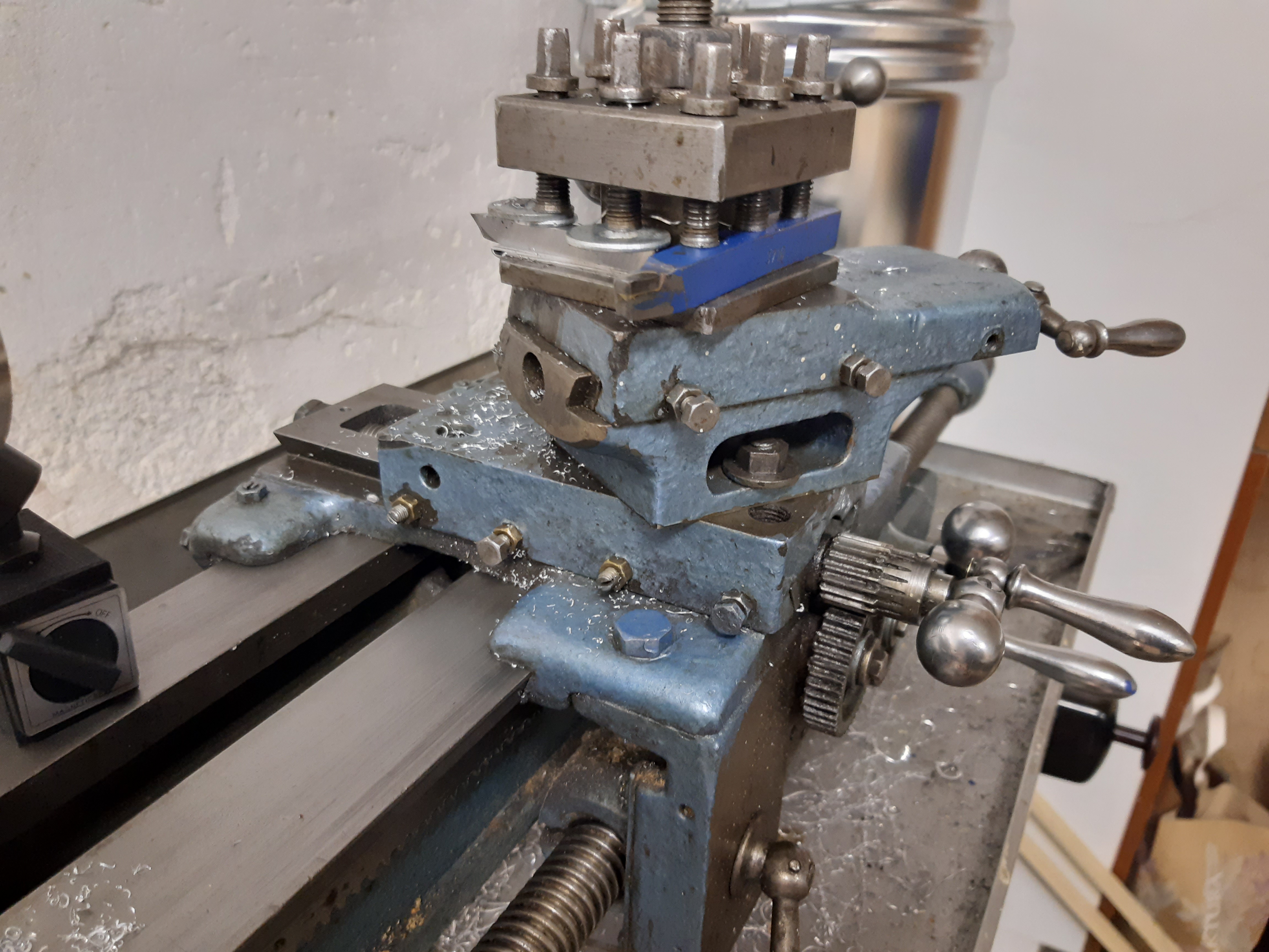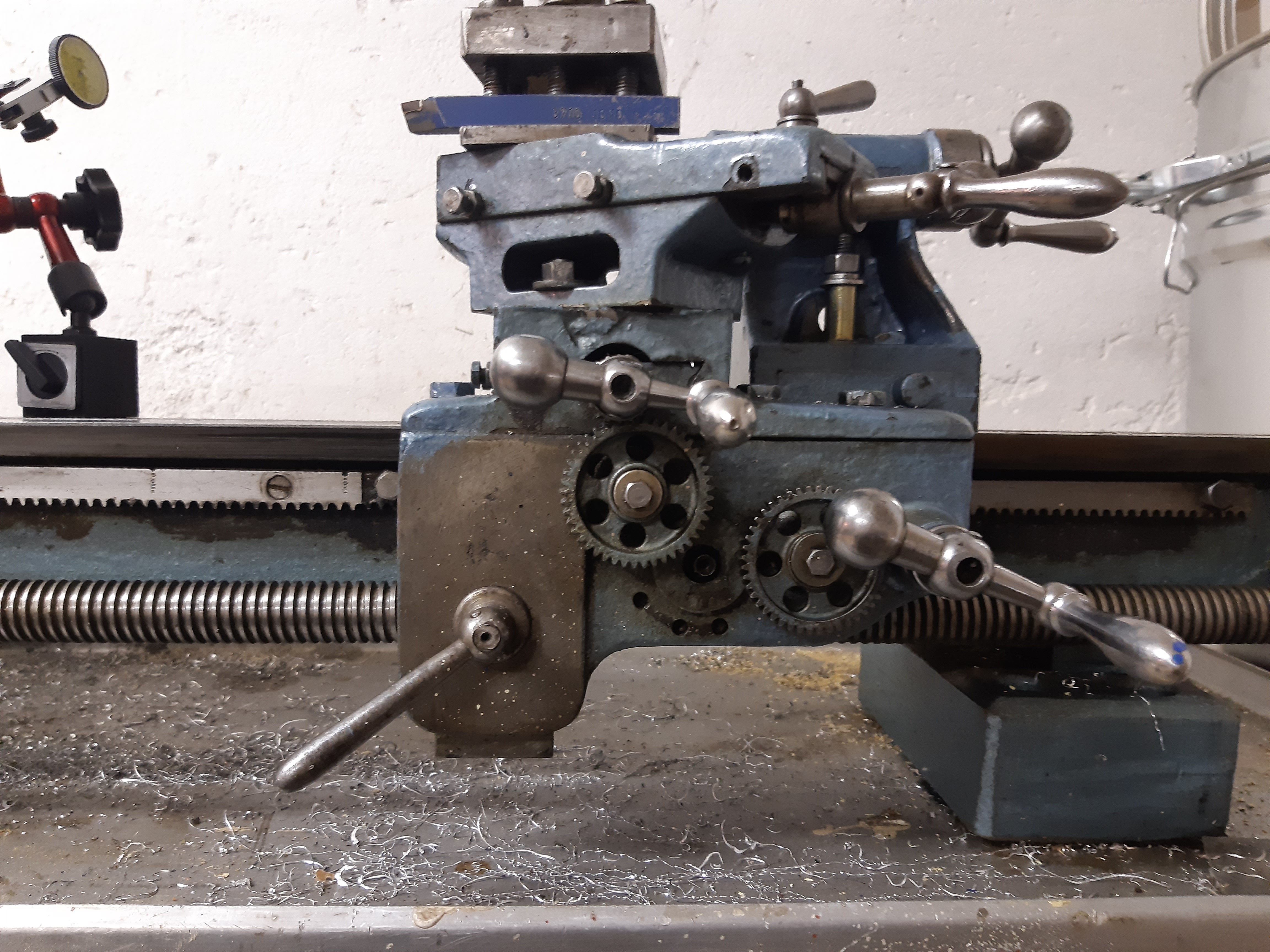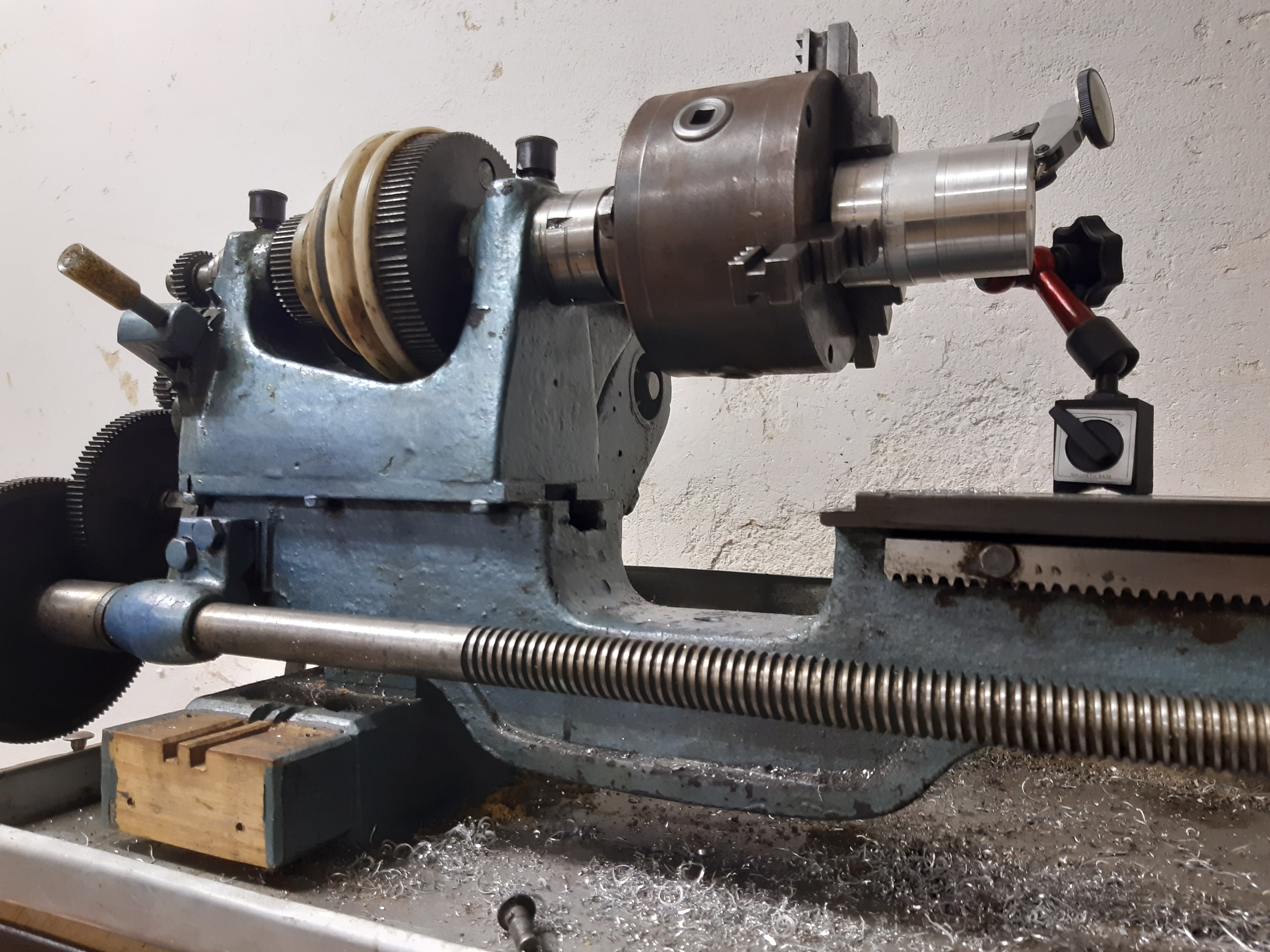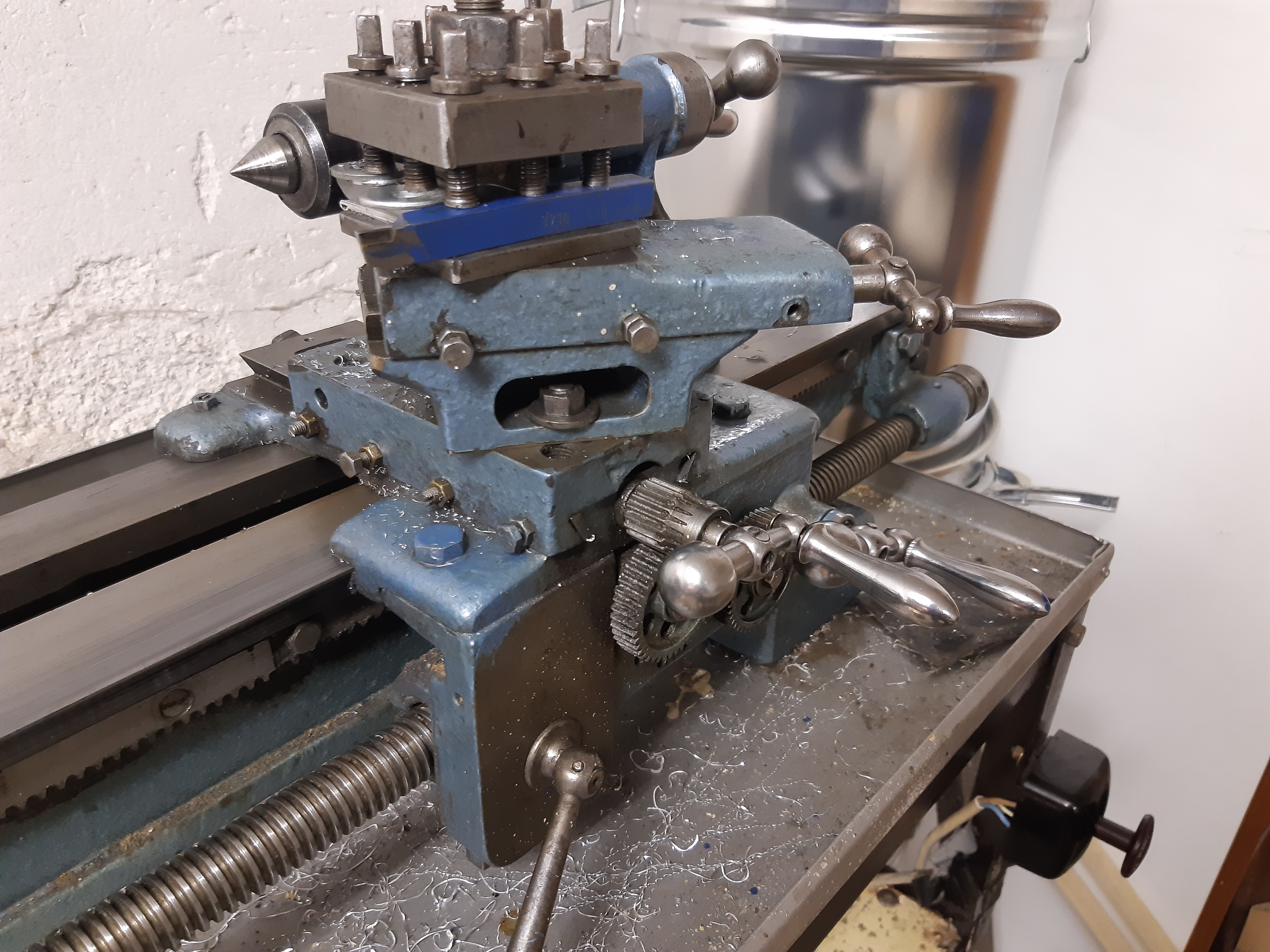 Jedná se o menší stolní soustruh, dříve měl pravděpodobně litinové nohy, dnes přidělán k desce stolu.
