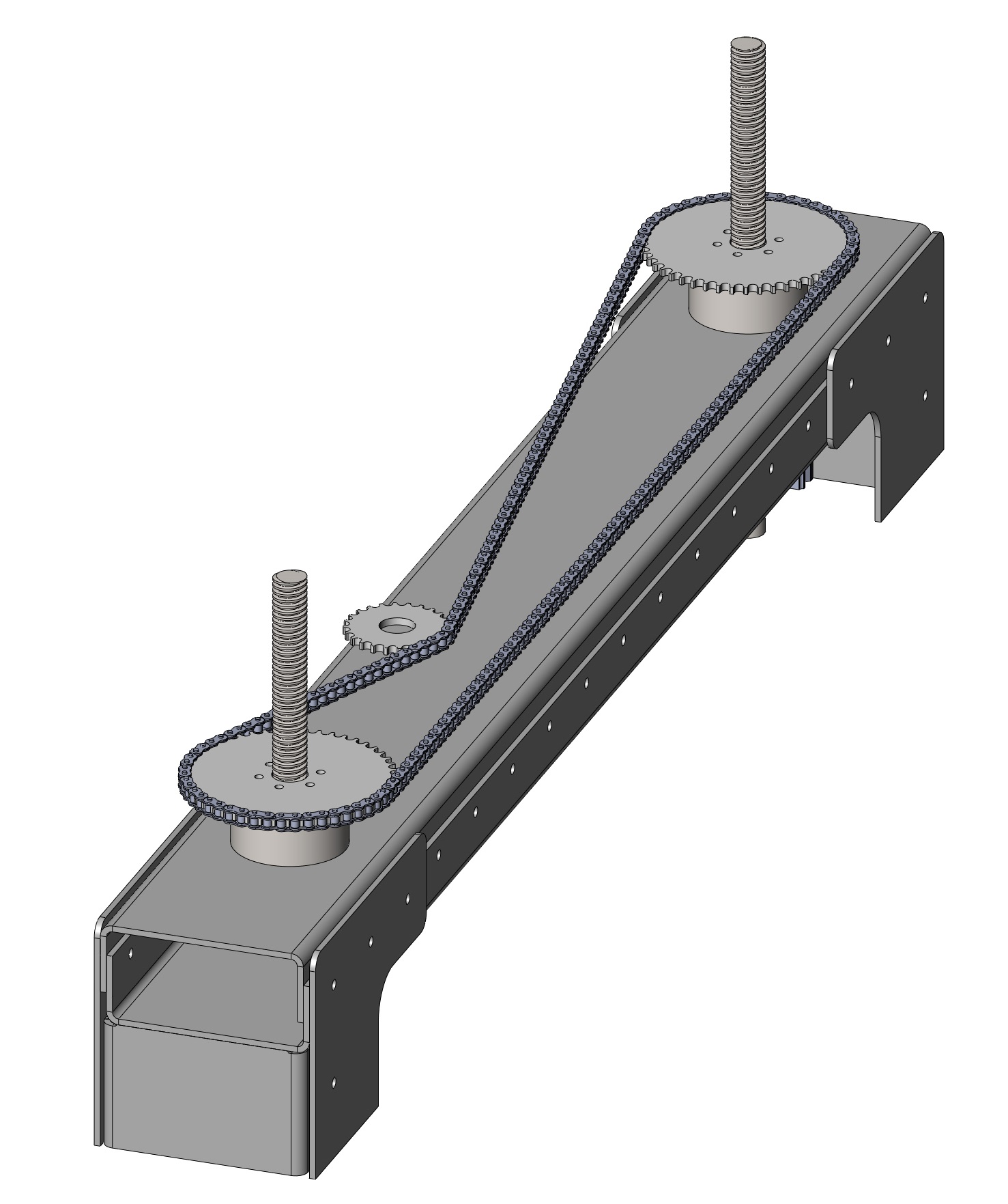 Mám dva trapézové šrouby, které by se měly synchronně otáčet. Napadlo mě spojit je řetězem, první naivní návrh přikládám. Nenašel by se prosím někdo, kdo má s řetězy zkušenosti? Já to řeším poprvé a nerad bych udělal chybu :-) Tuším například, že úhel opásání hnacího kola asi nebude stačit, ale určitě tam bude ještě něco.