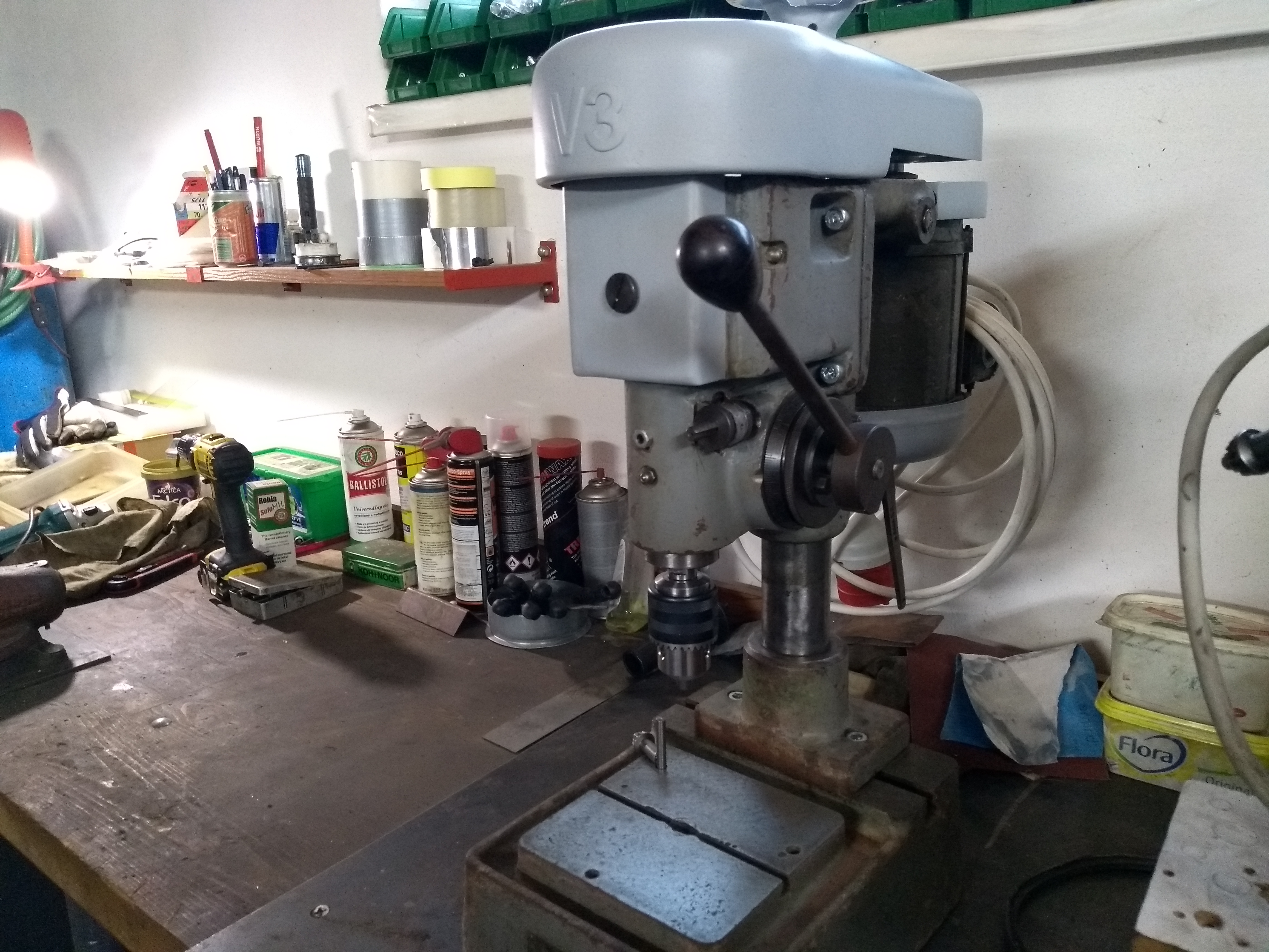 Taky zdravím.. Nojo, úprava:-) každej tomu říkáme jinak.Správně jsi pochopil,že to bylo na velké otáčky a proto jsem nabízel normální stolní vrtačku,se kterou bys mohl bastlit i ty tvoje díry do 10mm To sklíčidlo tam bylo právě kvůli těm otáčkám,to možná chápeš..Co určitě ani náznakem nechápeš, je ta řemenice na plochej řemen. Jen tak mimochodem-celá ta soustava (kvůli životnosti ložisek,ale hlavně přesnosti vrtání) byla vyvážená.A můžu tě ubezpečit,že v roce 1959 už bylo na světě světlo (žárovky v wolframovým vláknem se už daly běžně koupit za pár korun na každý vesnici v Jednotě),svět byl barevnej, auta ( tedy u nás) jezdily na vzduchem plněných pneumatikách a poháněl je benzín,kterej se už nemusel kupovat v apatyce, a kožený řemeny se používaly tak ještě u bucharů a mlátiček,ale v pohonech takových strojů už byly rozhodně modernější vynálezy- na tyhle aplikace typicky nekonečně tkané řemeny, dokonce i se zátěrem anebo plastové( teď si nevybavím,jak se jmenovaly,vypadaly jako průhledná hladká páska do páskovačky- a ty se dokonce na míru lepily..)