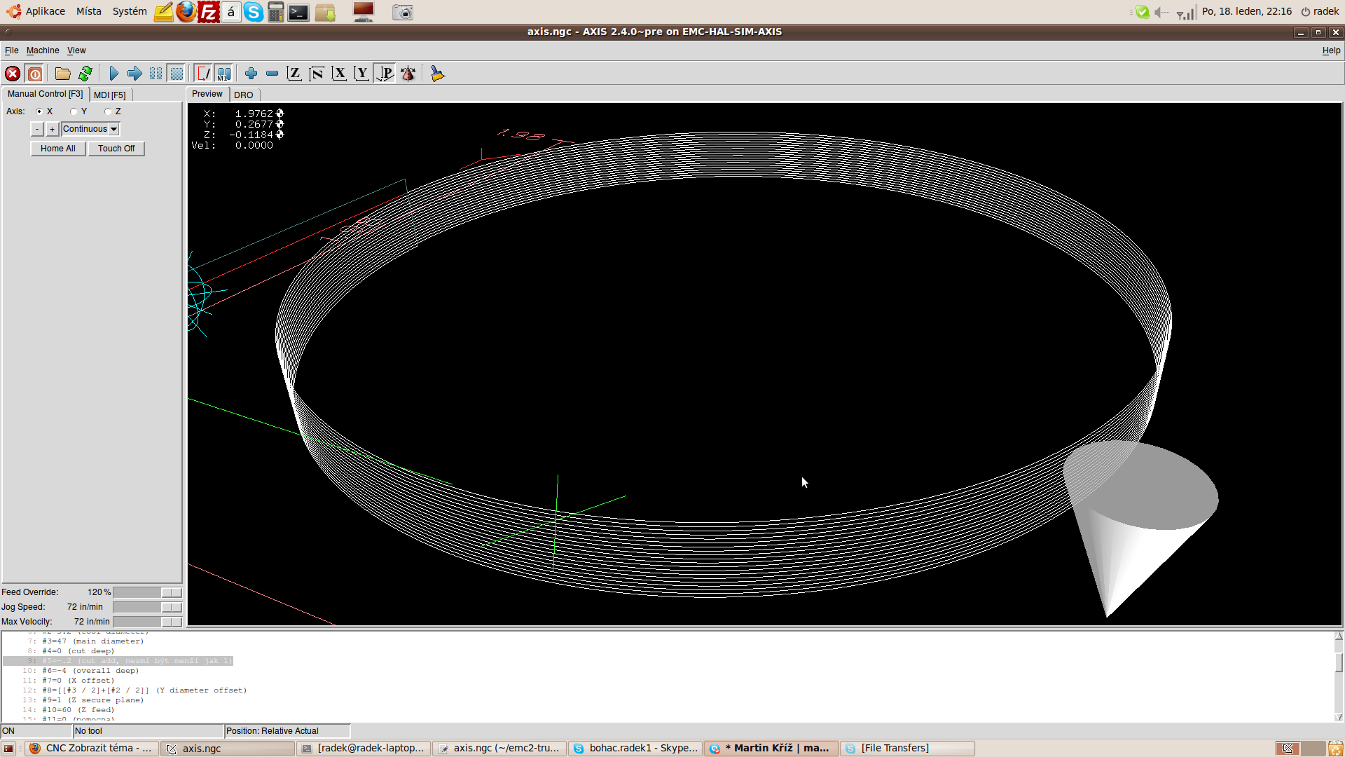Ale to mi funguje bohužel jen teoreticky. Po natažení programu do EMC2 se vykreslí správně spirála. Po spuštění programu softwarově funguje vše jak má a osa Z se inkrementuje jak se postupně vykresluje spirála, ale motor na ose Z se vůbec netočí (interpretují se pouze příkazy G00 a G01 ale G02 i G03 prostě s osou Z nehne).