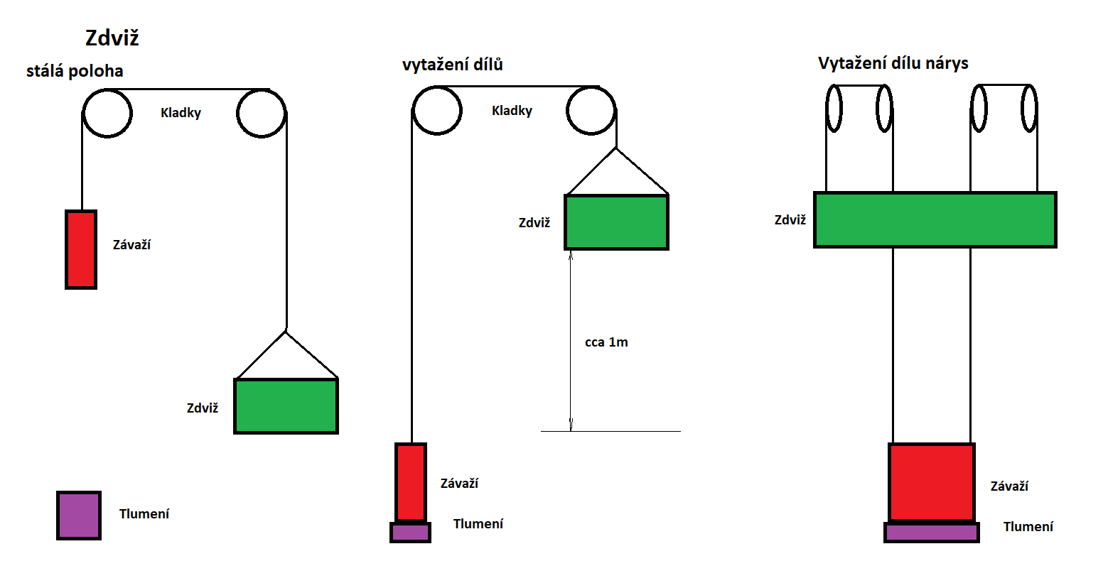 Potřebujeme zajistit plynulé zbrždění na konci dráhy závaží, tak aby případný ráz ve vytahovacích lanech při dopadu na konec dráhy nezpůsobil vyvvlečení lan z kladek popřípadě dílu z háků.