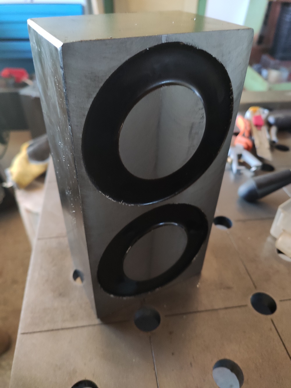 Vysvětlení pro ty, kdo si klepou na čelo, proč řeším geometrii magnetické vrtačky - vrtám s tím napřesno díry ve svařovacím stole