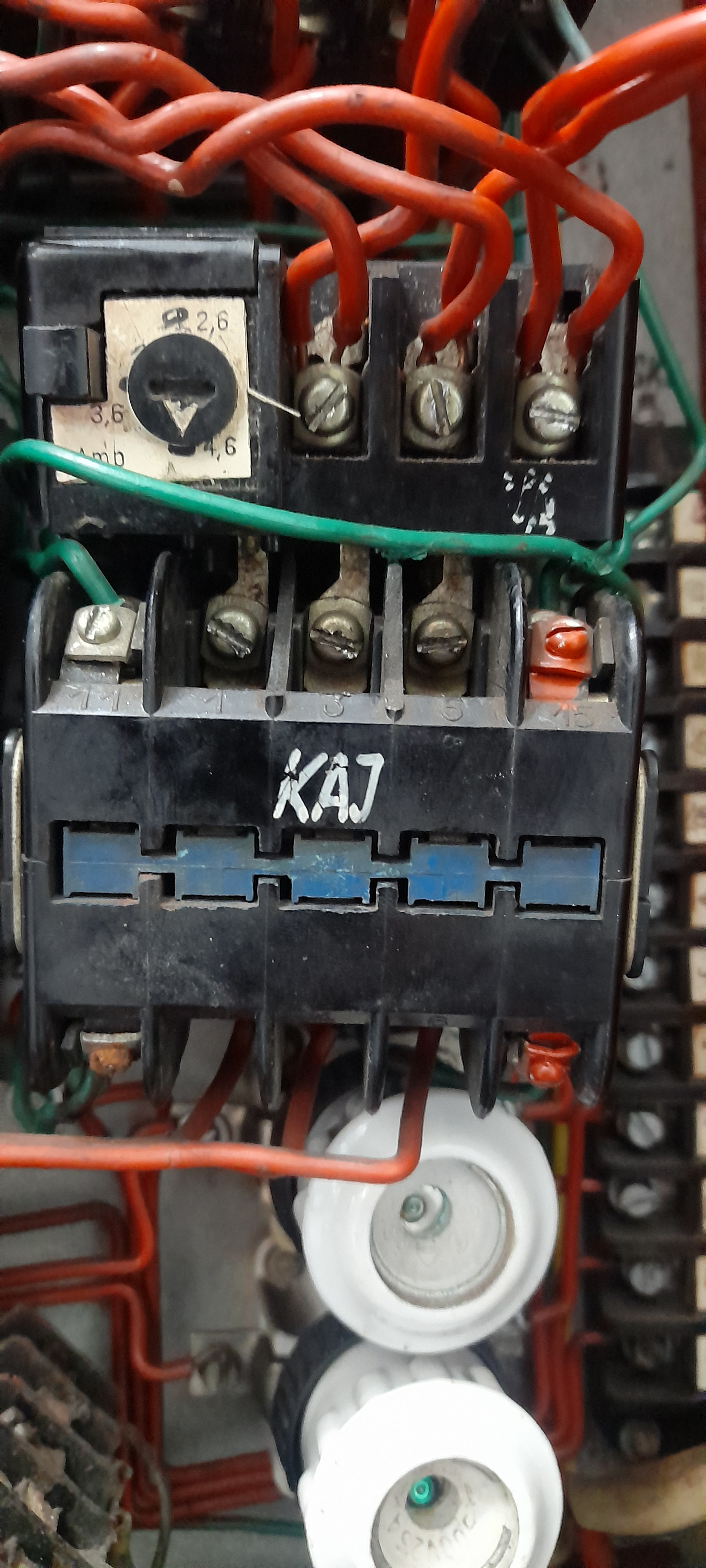 Frézka ME250 má dle schématu ovládací napětí 36V AC. Je to trochu neobvyklé napětí ale např. třeba Schneider electric cívky stykačů pro toto napětí vyrábí. Stykač KAJ je jedním z reverační kombinace pro motor posuvu, ten má výkon 1,5 kW.