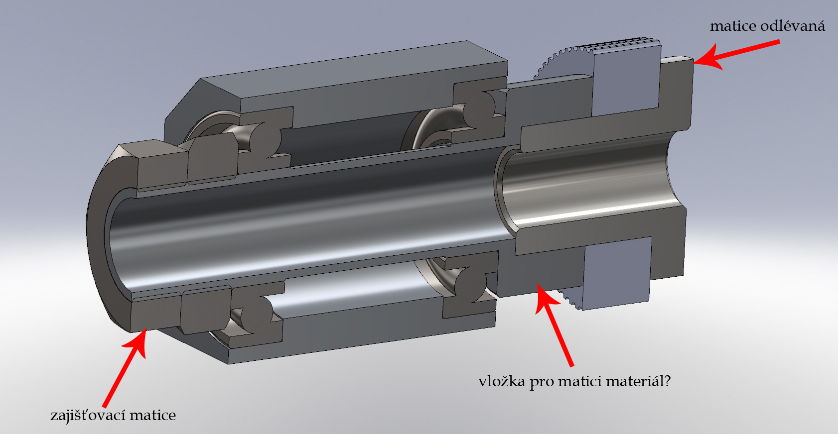 Takže půjdu jednodušší cestou. Chtěl bych to udělat tak jak to je na přiloženém obrázku jen s tím, že motor je otočen o 180°, Na stávající matici kterou mám v provozu mám použitá obyčejná jednořadá ložiska. Na nové bych chtěl použít ty ložiska s kosoúhlým stykem, jen nevím jak to druhé zajistit a stáhnout proti prvnímu, napadlo mě použít lepidlo Loctide 641 na rozebíratelné spoje. Přijde mi to jednodušší něž vyřezávat do odlévané matice závit, nehledě na to, že stejně nemám tak velký očka na závity. Máte s tím někdo zkušenosti?