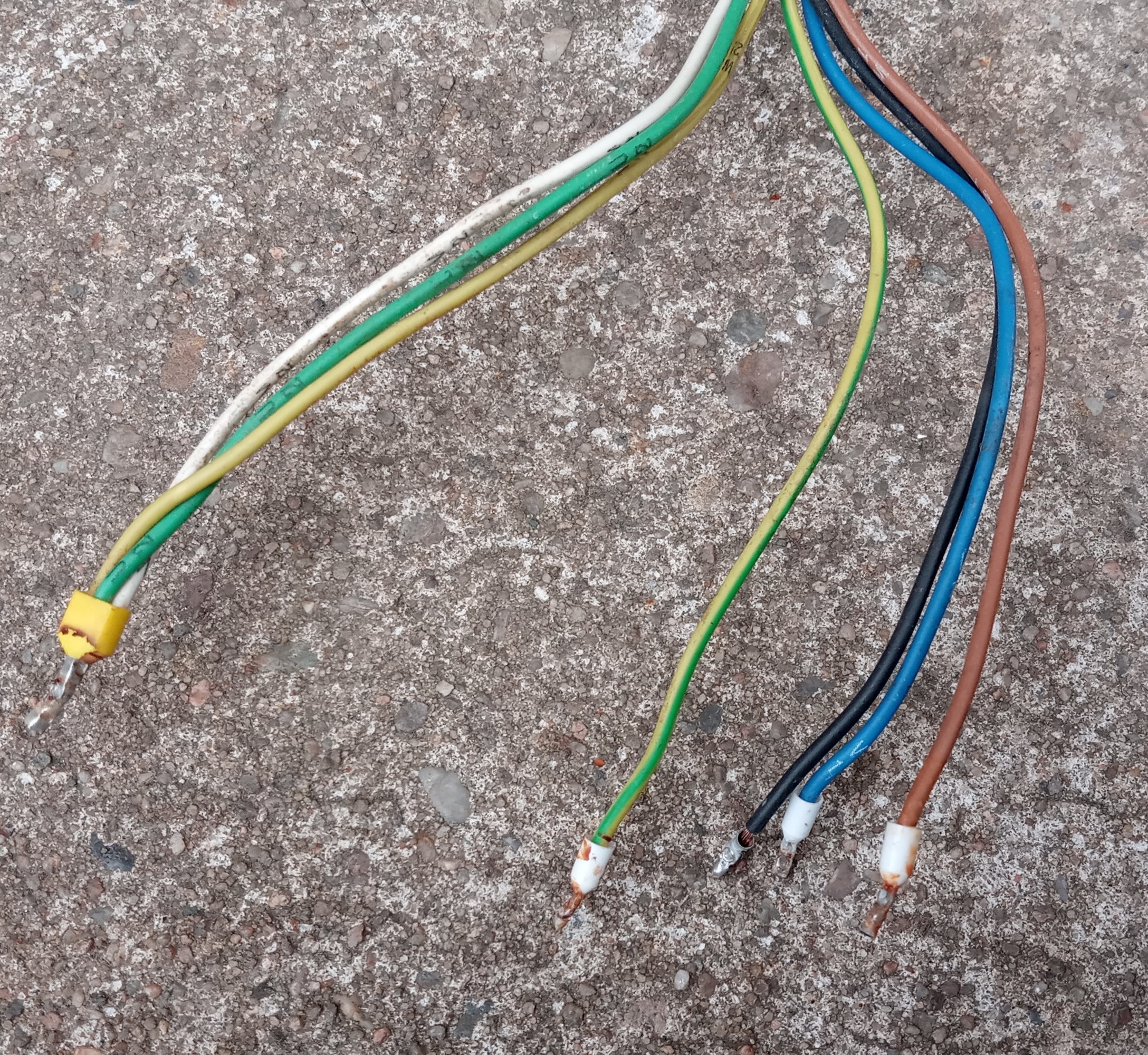 Řekl bych že motor je zapojený na 400V ,do hvězdy a to tak že jeden konec vinutí je propojen , do hvězdy - to jsou ty dráty propojené ,do dutinky- Barva bílá zelená a žlutá. A na druhý konec vinutí - To jsou ty dráty Barva černá hnědá a modrá tam se zapojí fáze L1 L2 L3
