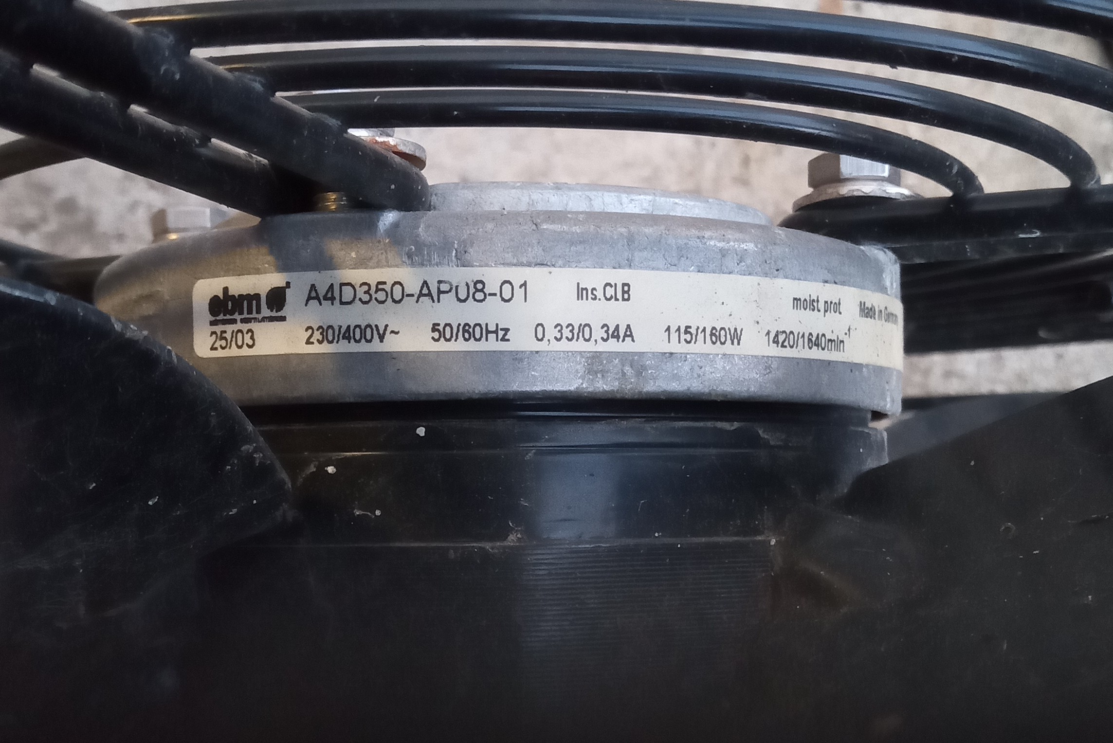 Před připojením na síťové napětí by si moh provést rychlou kontrolu jestli nejsou ve zkratu proti zelenožlutému drátu (kostra) všechny ostatní dráty. Pokud toto bude v pořádku a motor není ve zkratu. Doporučuji ještě proměřit dráty mezi sebou ( jestli mají všechna 3 vynutí stejnou ohmickou hodnotu) a to tak že se proměříš černý hnědý a modrý drát samostatně proti vinutí spojenému do hvězdy - to je proti té dutince, ve které jsou spojený dráty barva bílá zelená žlutá. Pokud naměříš 3x stejnou ohmickou hodnotu je pravděpodobně motor v pořádku . Až potom budeš motor zkoušet a , byť provizorně připojovat na 400v nezapomeň připojit i zelenožluty samostatný drát na uzemnění- na kostru . To aby v případě zkratu a objevení se síťového napětí na kostru ventilátoru vybavila ochrana – jistič . Doporučuji proměření , zapojení a vyzkoušení Přenechat na kamarádovi odborníkovi :-)