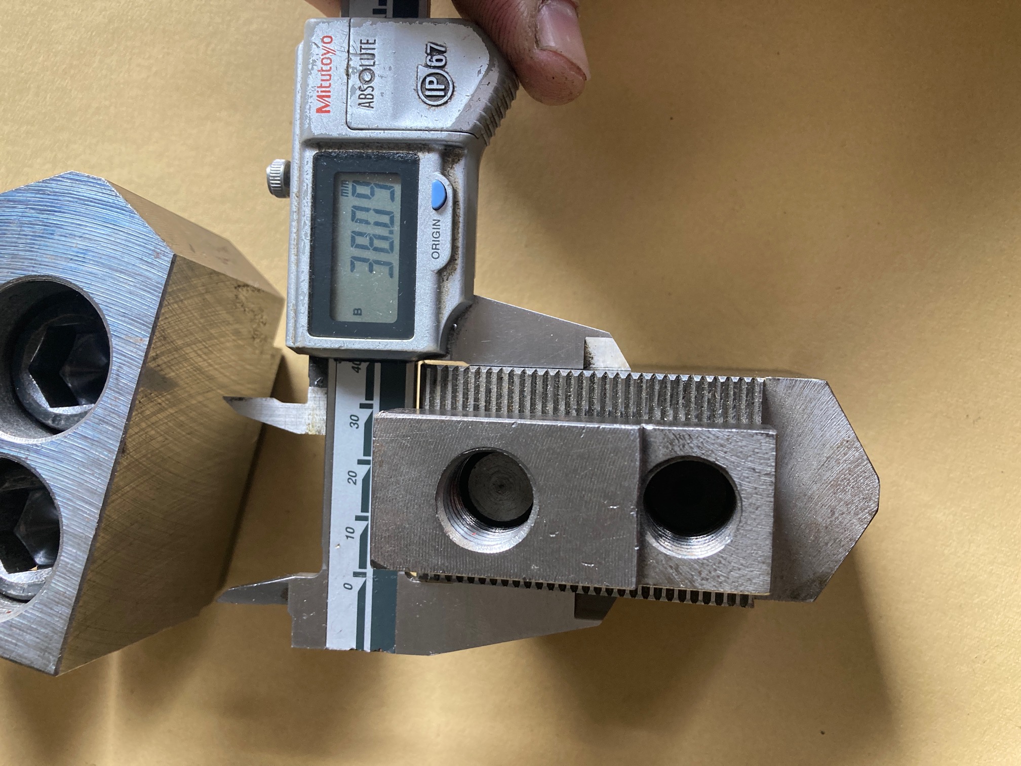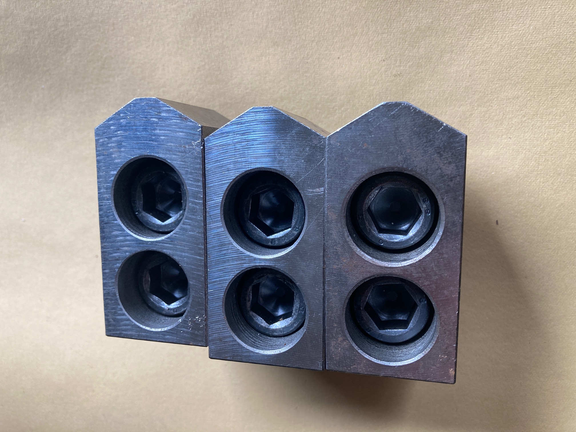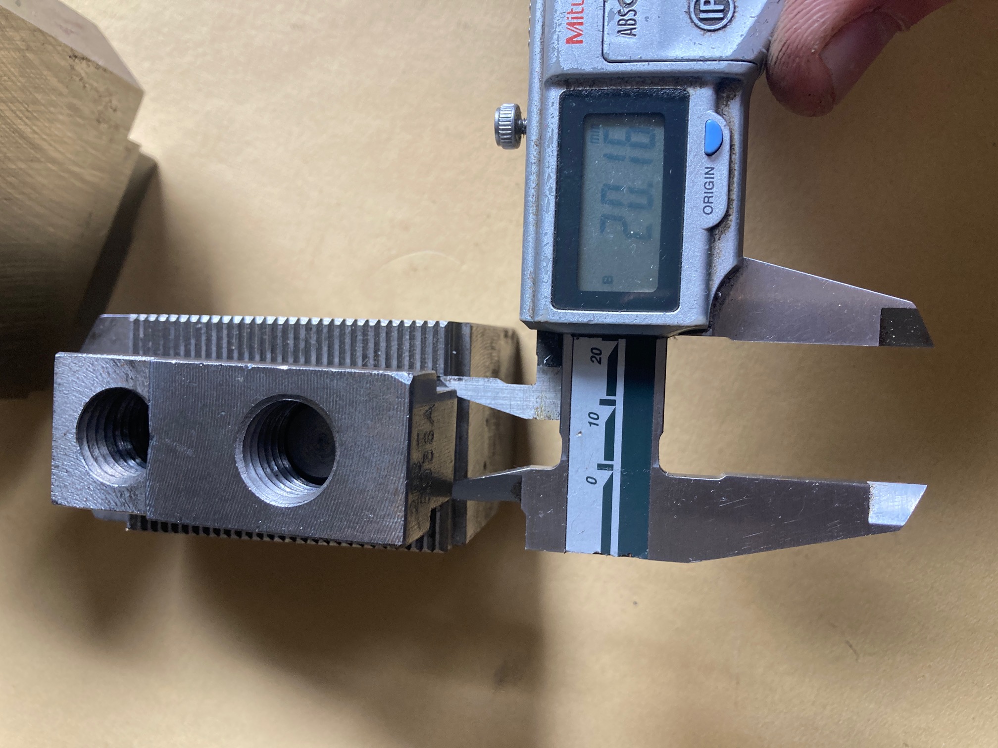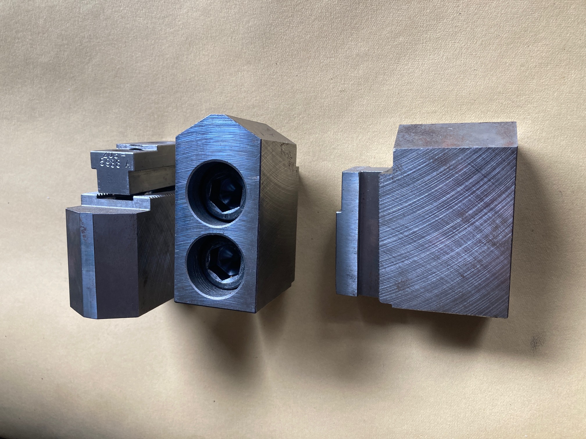 Nabízím sadu měkkých čelistí, stav a rozměr dle fotek. Rozteč drážkování 2mm. Vč. T- matic a šroubů M16. Cena 800,- za sadu.