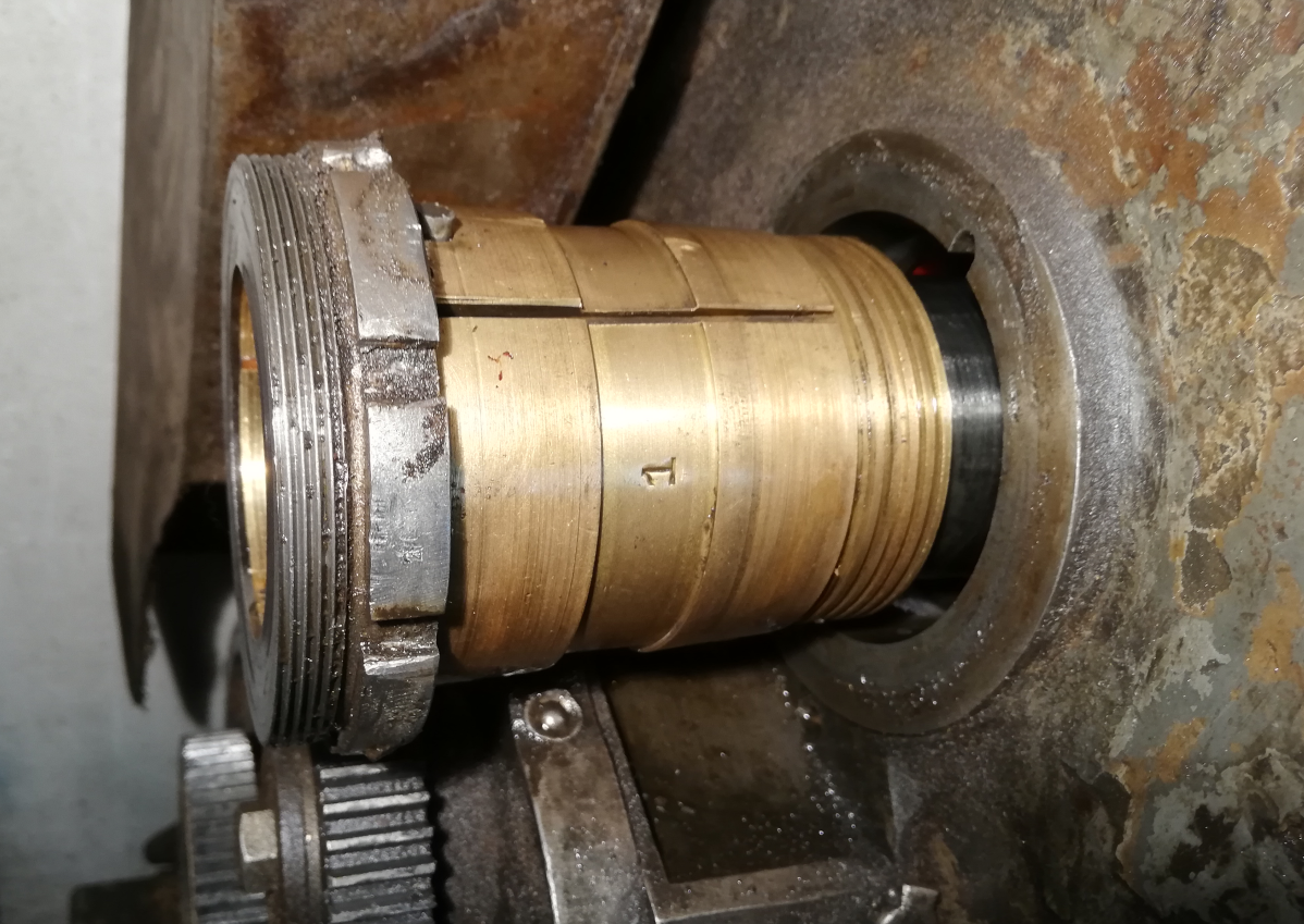 Zobral som mosadznú platňu oprel o predok vretena a kladivom posunul kusok naspäť smerom od suportu - kolesá v skrini majú opäť vôľu (tých pár stovák).