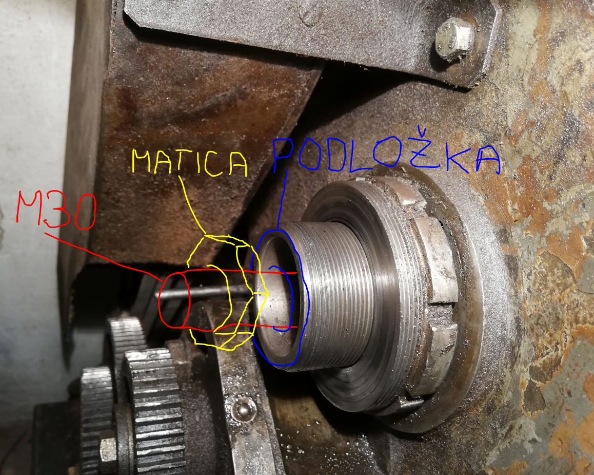 Predná vonkajšia - tú som tiež povolil o cca 10mm a tým som posunul vreteno smerok k suportu - išlo to len s kladivom
