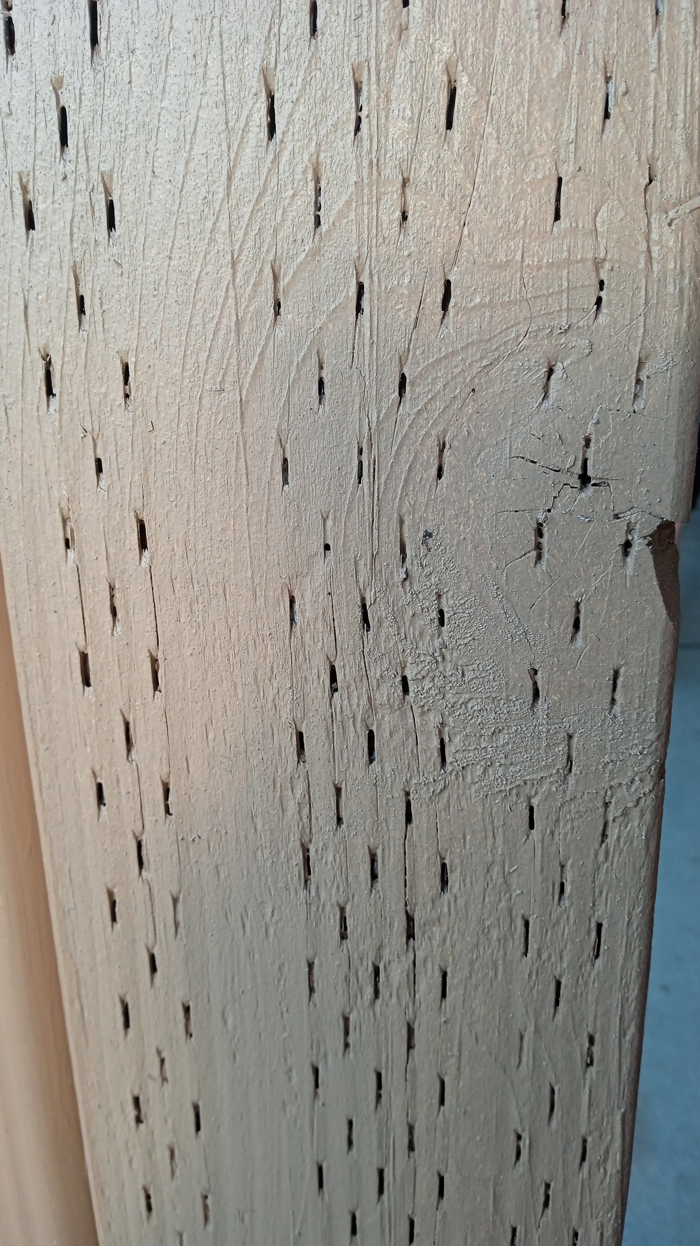 Ahoj, setkali jste se někdy s takovým povrchem na dřevě? Viděl jsem pár konstrukcí, na kterých to bylo. Je to od výroby, nebo schválně? Kvůli sušení, impregnaci, nebo prostě jen otisk zubů z opracování