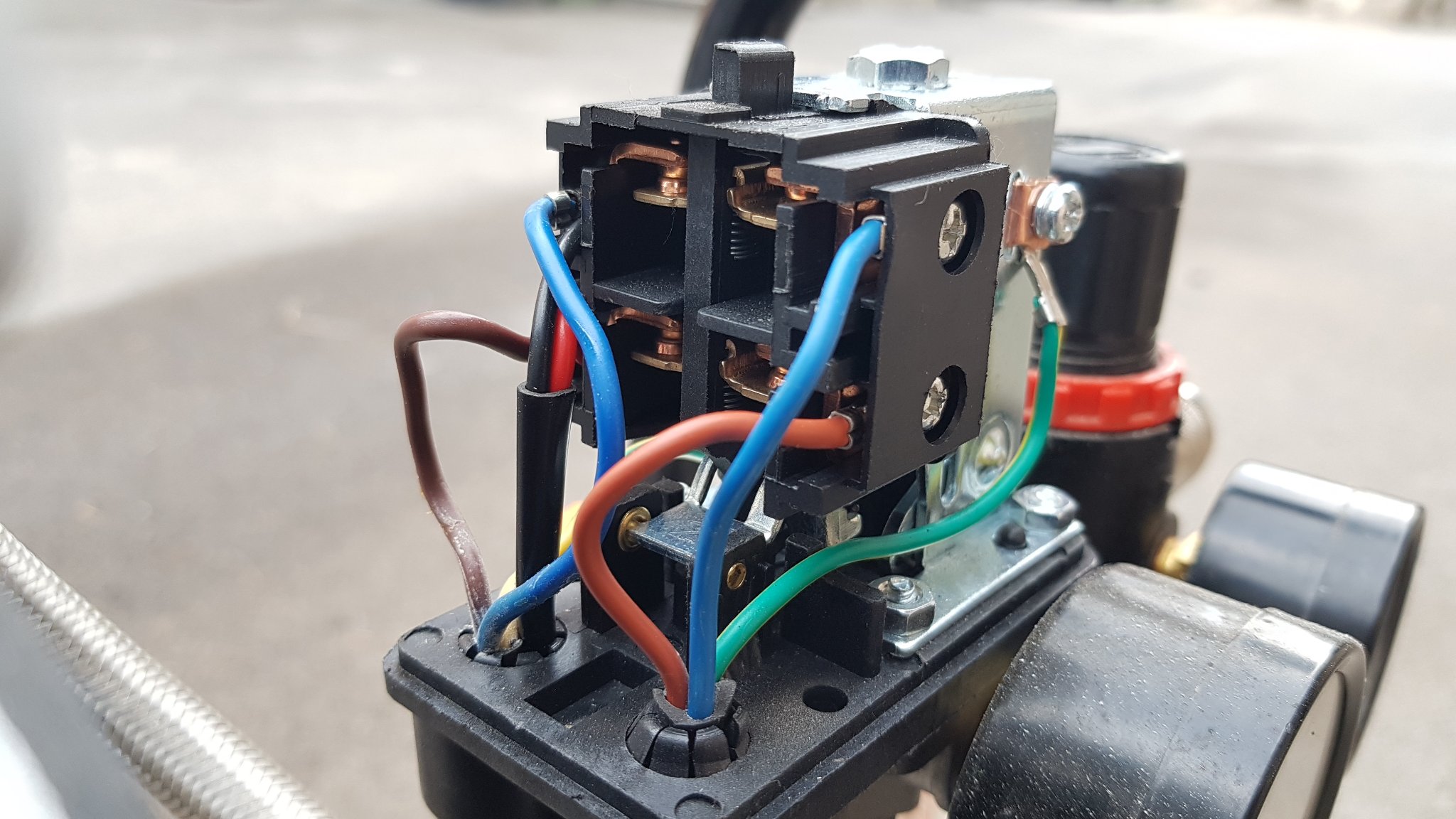 Mezi kompresorem a nádobou je zpětný ventil (to mosazné). Když běží motor sepne venti a uzavře odfuk. Když motor vypne tak ventil otevře a odfoukne vzduch z prostoru mezi válcem a nádobou jinak se motor do protitlaku nerozjede. Takže asi vadný zpětný ventil.