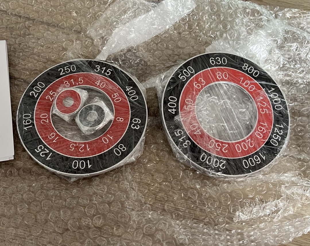 Prodám štítky na převodovky pro frézku FN 25. Novovýroba, sítotisk, velké kolco je AL tl. 2mm, menší terčík je AL tl. 1mm.