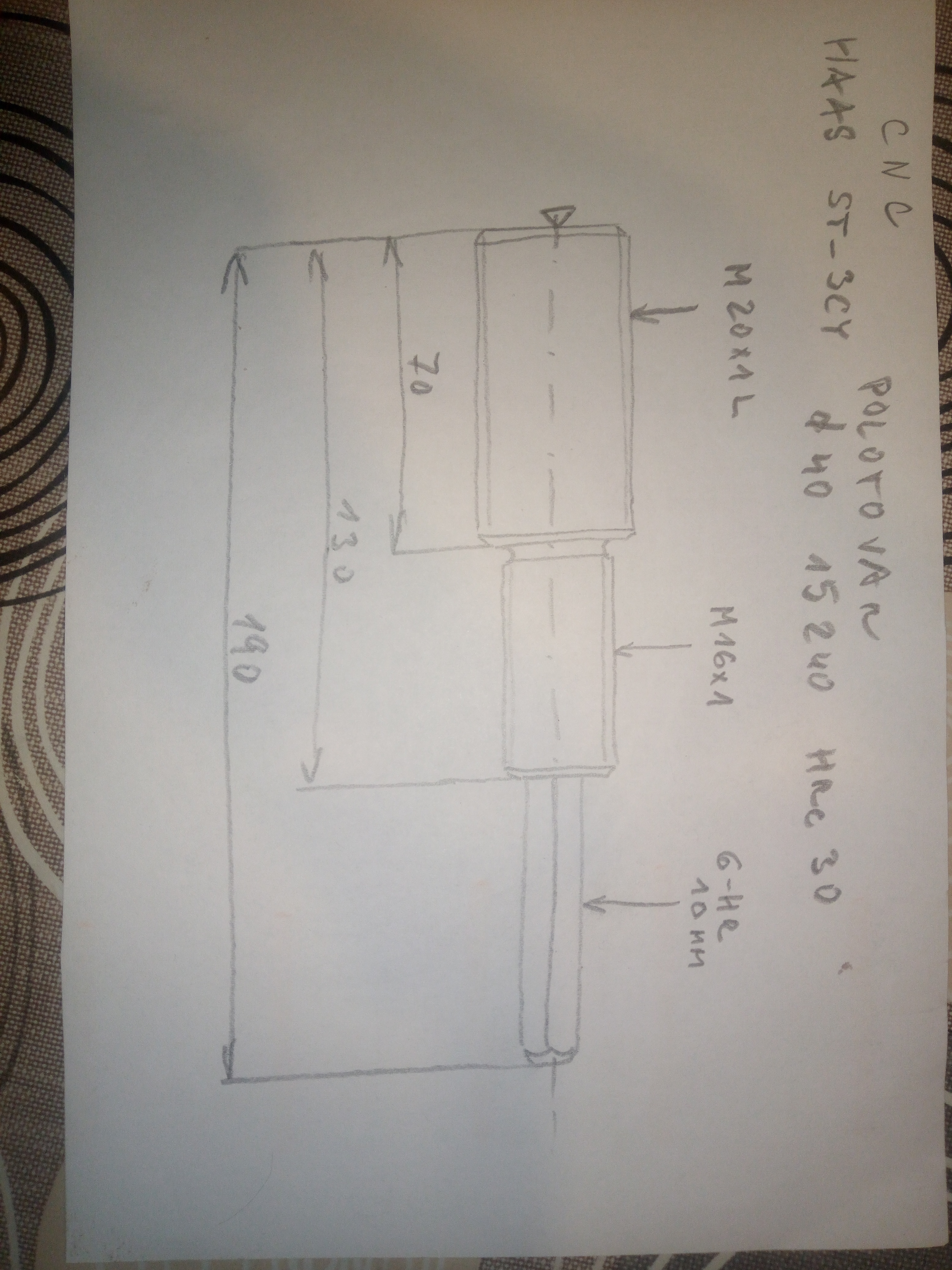 Jel bych zleva, důlek, sjet čelo, vysunout potřebnou délku, opřít hrot, sjedu na 5? Špon na hrubo povrch, pak pr 20 na čisto, pr 16, zápich pod pr 16, závity, nakonec poháněným nástrojem ten 6hr, sražení a odpíchnout. Tak bych to jel já, odhad času 20min na cnc?