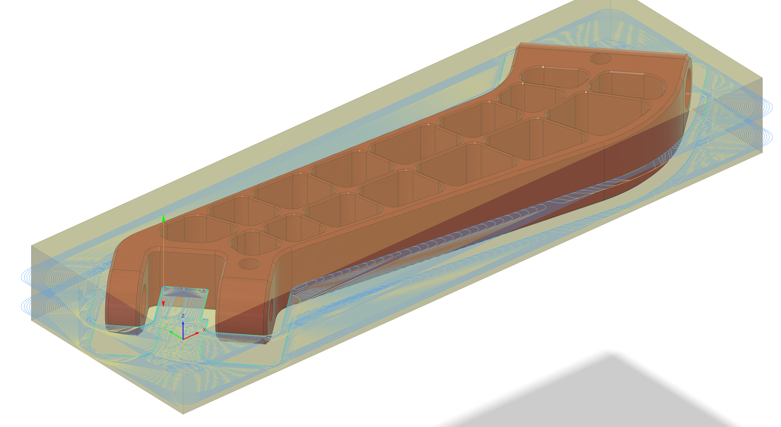 Mám serva Leadshine a nastavenou přípustnou chybu na 1/2ot. tedy při šroubu 10mm je to těch 5mm finálního pohybu. Mám ale za to, že servo pokud nestihne najít správnou polohu, tak to během chvílky napraví a já bych to vlastně neměl pozat. Jenže ne. Prostě se cvelý tvar posunul jako ke mně. Díky tomu jsem zezadu vzal více a zepředu měně. Zastavil jsem to a najel znovu sondou na referenční nulu obrobku. Vše bylo v pořádku. Tak nechálu jak je možné, že se něco takového stalo. Uděll jsem tedy změnu a zpomalil jsem přejezdy, takže RAPID je jen 15m/min a "na prázdno" jsem encha pouze 5m/min. No a místo držet se dole jsem dal vytahovat nad obrobek. Tak uvidíme.