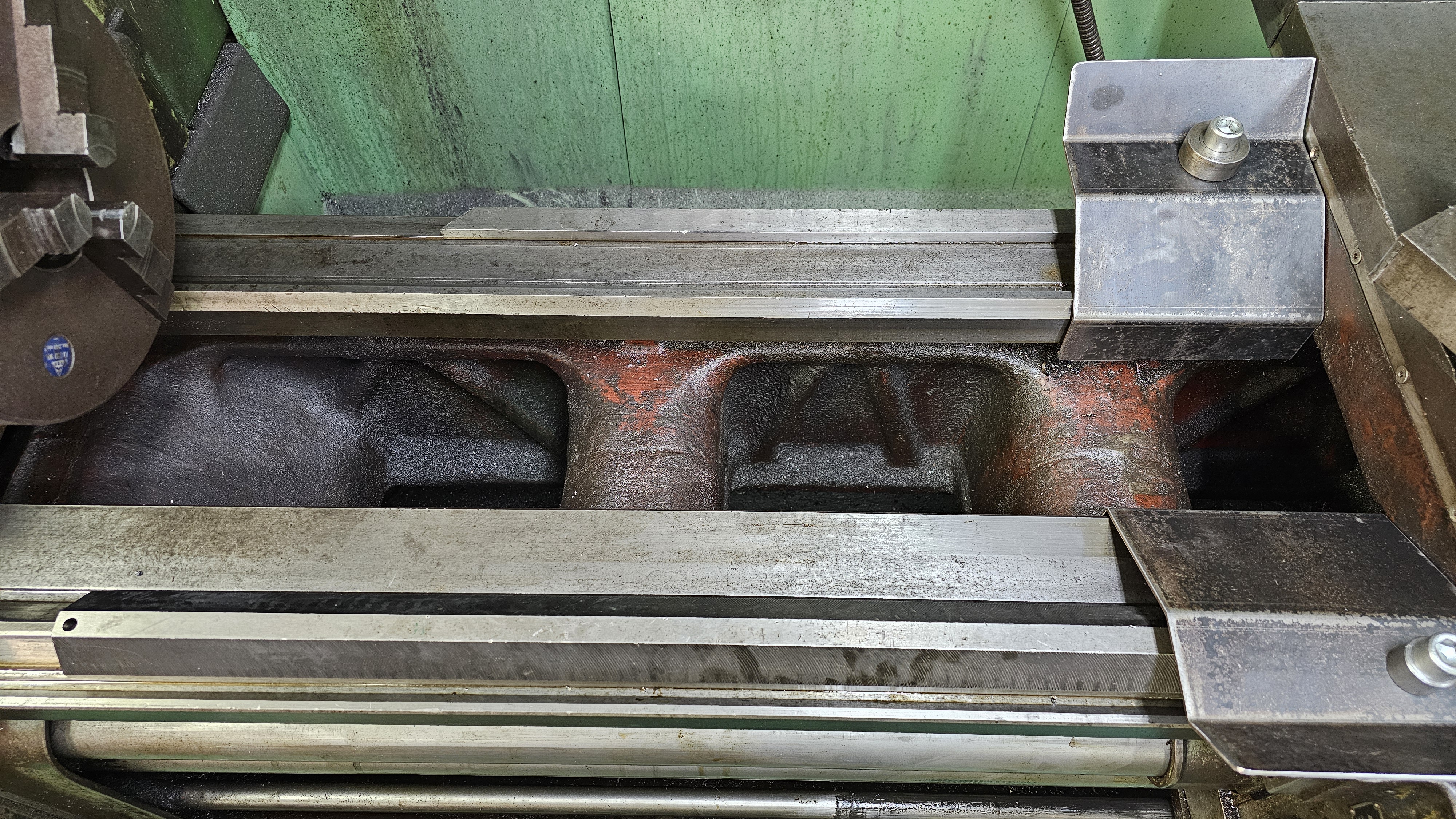 Na mašině je nějak podivně nasazená zadní část originální ruský 250, ale nějak mi to nesedí, druhá půlka je před soustruhem. To sklíčidlo je za situace kdy je kompletní a s dobrejma čelistma perfektní. Tohle už moc nebylo, a tak na ně někdo narouboval tu 200.