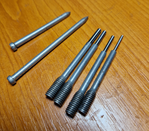 Používám ty kalené hřeby do nastřelovací pistole do betonu. Měl jsem je doma po dědovi, ale myslím, že to není nic nesehnatelného. Nabrousil jsem si na tom různé průměry, protože to co prodávají je bláto.
