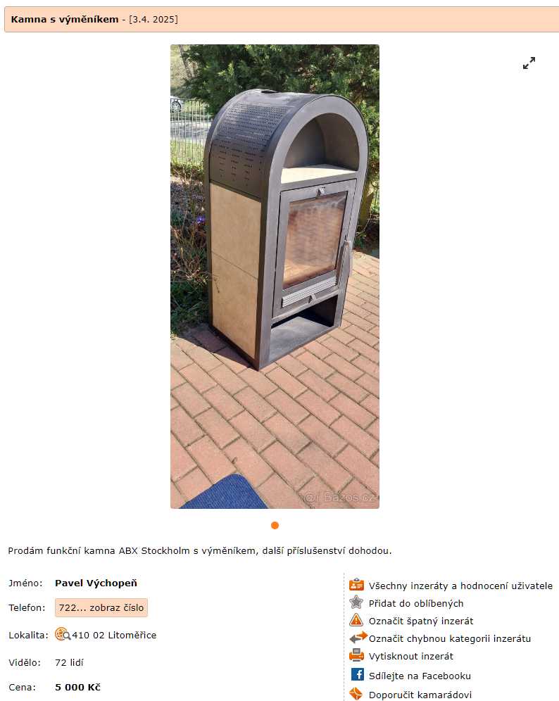 chtel bych v zastoupeni nabidnout starsi krbova kamna s vymenikem ABX stockholm. prodava je soused duchodce, stari cca 13 let, provozovany jako obasne pritopeni k hlavnim peletkovym kamnum. snad by mel byt nekde praskly rost, bez ztraty funkcnosti. kamna inzeruje na bazosi za 5000kc, ale protoze je dulezite se jich vcas zbavit, mam povolenou jit s cenou dolu jak bude potreba
