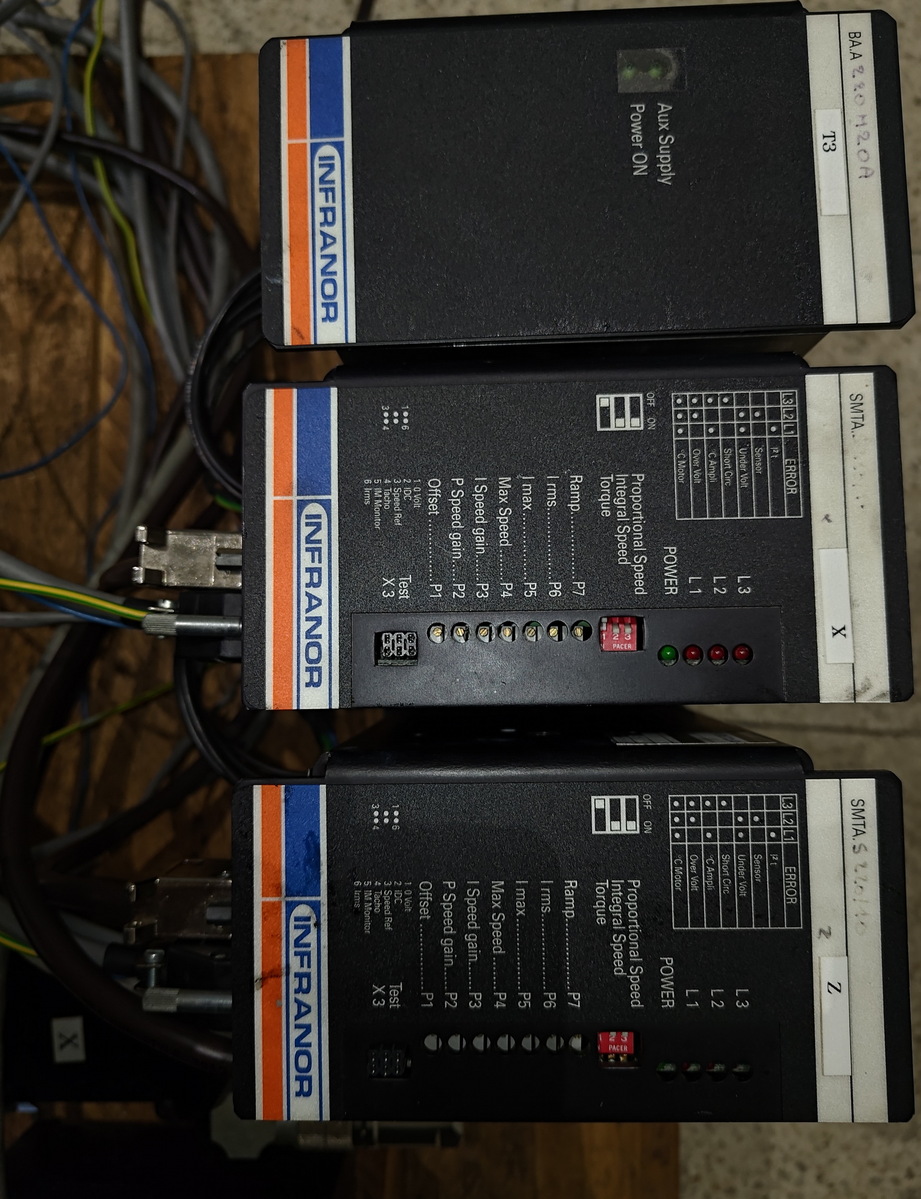 Drivery INFRANOR SMTA.S 220/10, motory MAVILOR BS072A.00.010T.00, řízení +-10V, napájení 220V AC, maximální moment jsem naměřil okolo 4Nm což odpovídá cca 400w servum.