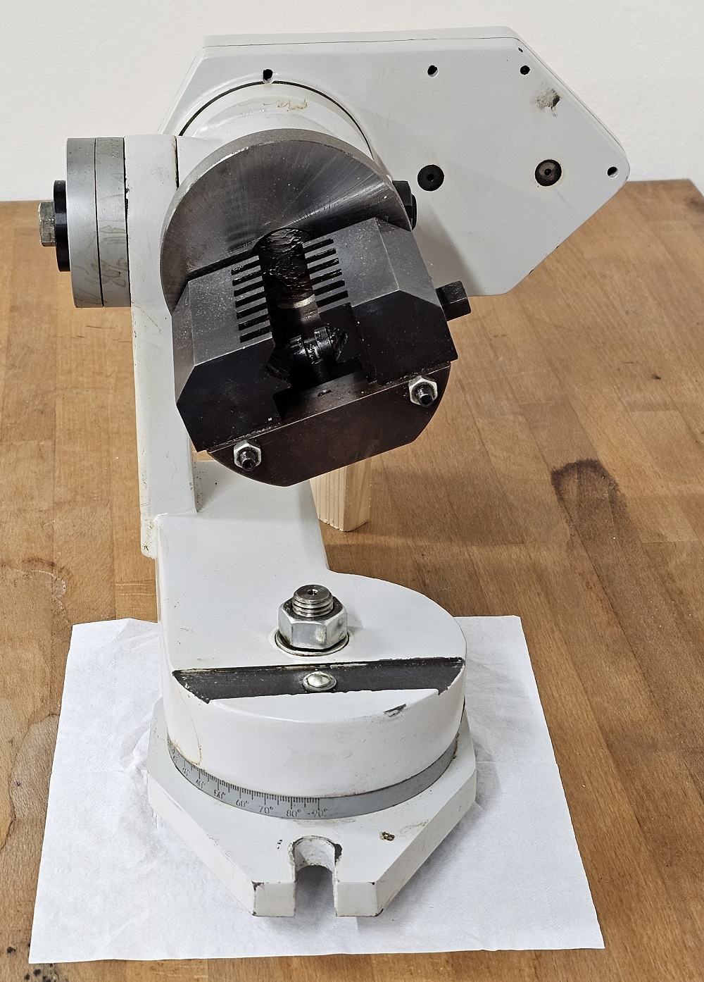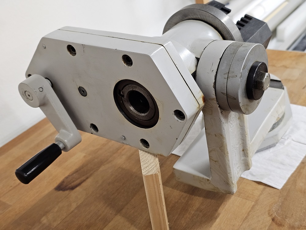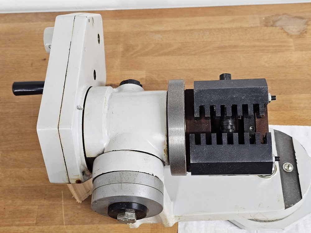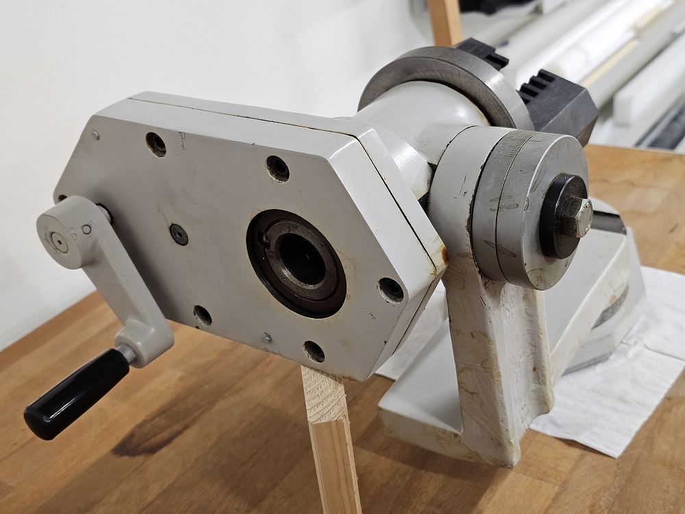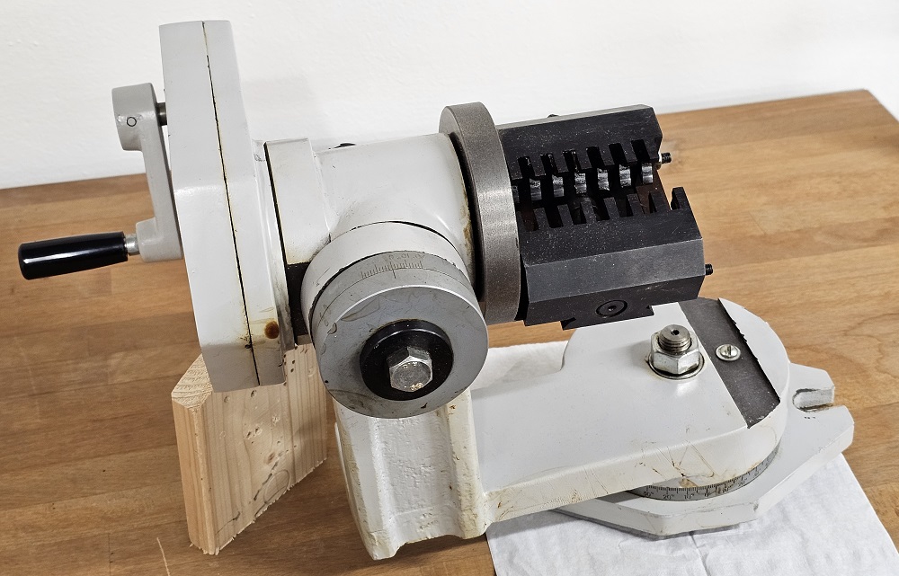 Nabízím záhadný čínský přístroj. Je to příslušenství k brusce, nastavitelné ve dvou osách. Když se točí tou klikou, kleština se otáčí a vyjíždí dopředu a zase se vrací. Prý je to určené k broušení vrtáků, ale nikdo neví jak se to používá. Já jsem za posledních dvacet let nenabrousil jediný vrták (ty drahé posíláme do brusírny), takže to nebudu ani zkoušet. Cenu neuvádím, t.j. v souladu s pravidly sekce je to zdarma. Jediná podmínka je vyzvednutí v Praze — Bohnicích.