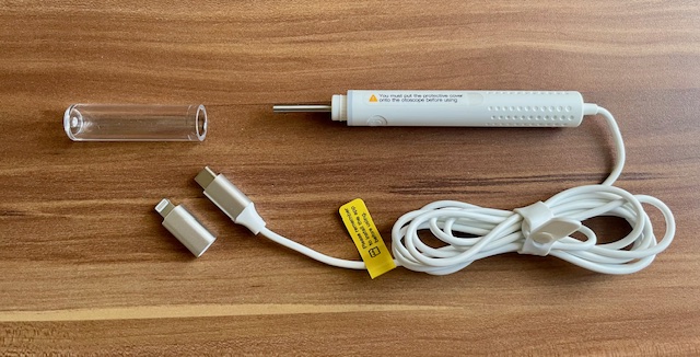 Jako další věc tady mám krabici tužkových mikrokamer s objektivem v trubičce o průměru 3,9mm včetně přisvětlovacích LED diod. Specifikace viz.foto Připojení přes USB-C. Součástí i redukce pro iPhone USB-C / lighting.