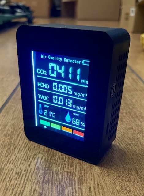 Malý detektor kvality vzduchu nejen pro dílnu. Možno zavěsit na zeď nebo kamoliv postavit.