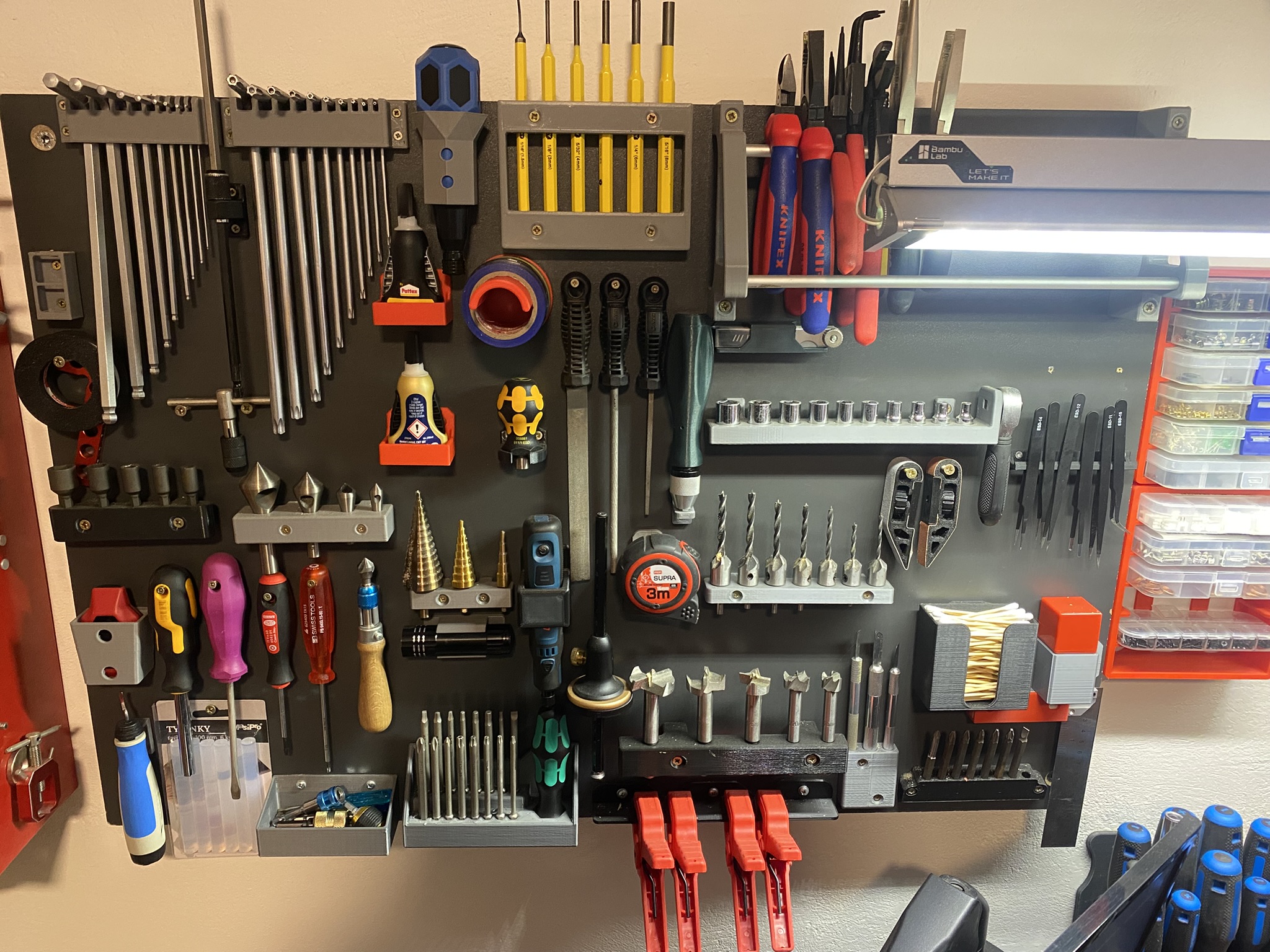Stěna na nářadí z kusu dřevotřísky za 90 kč z obi a tištěný držáky, většinu .stl mám tady: