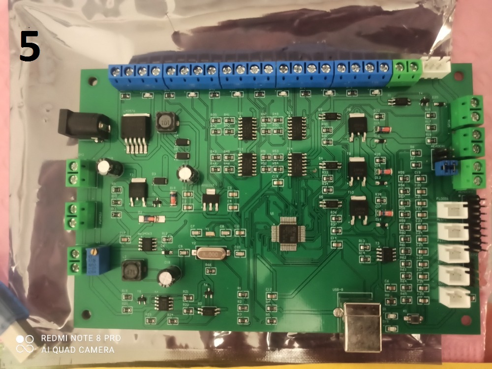 č3. pěti osá pohybová deska, cpu gd32f303cbt6, grbl 1.1f, akorát tam nějak nefungovaly příkazy m8, m9 víc jsem se tím nezabýval.
